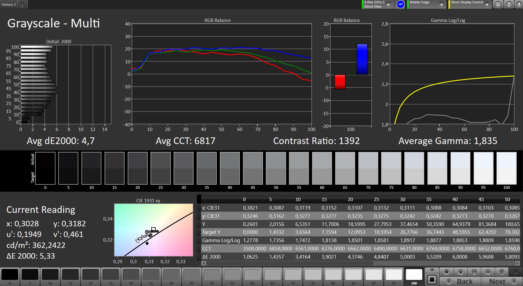 | Greyscale dE 2000 * | 4.7 | 1.1 77% | 1.4 70% | 5 -6% | 1.6 66% |