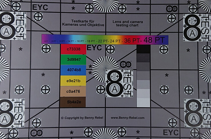 Il nostro test chart appare troppo scuro anche quando viene fotografato in condizioni di luce controllata. Inoltre, c'è una leggera sfocatura della carta negli angoli inferiori dell'immagine. Il nostro dispositivo di prova riesce a catturare dettagli e strutture sottili.