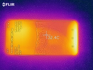 La generazione di calore dello smartphone è generalmente minima. Quando non è in uso attivo, la temperatura è rimasta al di sotto dei 30 °C (86 °F) in ogni punto misurato. Se l'utente utilizza giochi graficamente impegnativi, le temperature salgono fino a 36 °C (96,8 °F) in diversi punti. Anche questo livello di calore è completamente innocuo. Detto questo, abbiamo usato il telefono per un po' di tempo con la custodia inclusa nella confezione, che dopo vari test di riferimento è risultata estremamente calda. Questa impressione è soggettiva, ma è possibile che la cover impedisca uno scambio termico efficace. Di conseguenza, diremmo che l'usabilità della cover è discutibile.