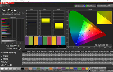 Il menu di impostazione offre all'utente diverse possibilità di regolazione per la riproduzione dei colori dello schermo. Nella configurazione originale dei colori con l'opzione "Standard", tutti i colori sono molto bilanciati nello spazio colore sRGB e la deviazione DeltaE è molto bassa a 1.1. Nel profilo "Auto" con l'opzione "Standard", la porzione blu è elevata nello spazio colore P3, facendo apparire l'immagine leggermente più fredda. Questo fa sì che la deviazione DeltaE aumenti a 2,6.