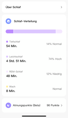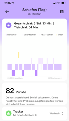 Gli orari del sonno e del risveglio corrispondono alla data della registrazione successiva. Al di là della breve fase di veglia registrata, tuttavia, ci sono state tre ulteriori interruzioni in cui la presenza era almeno sufficiente per guardare una radiosveglia per un confronto successivo. I tracker di solito registrano anche queste brevi interruzioni, ma qui mancano.