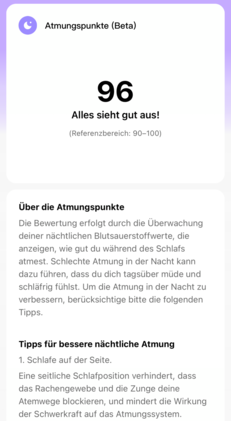 Per il test, misuriamo la saturazione simultaneamente in ogni caso con un pulsossimetro certificato dal medico. Nella serie di misurazioni, il Band 6 stima costantemente la saturazione troppo alta. Le deviazioni sono tra 1 e 4 punti percentuali.