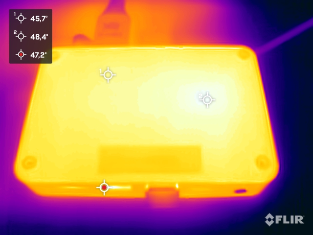 (-) Il lato inferiore si riscalda fino ad un massimo di 62.8 °C / 145 F, rispetto alla media di 36.4 °C / 98 F