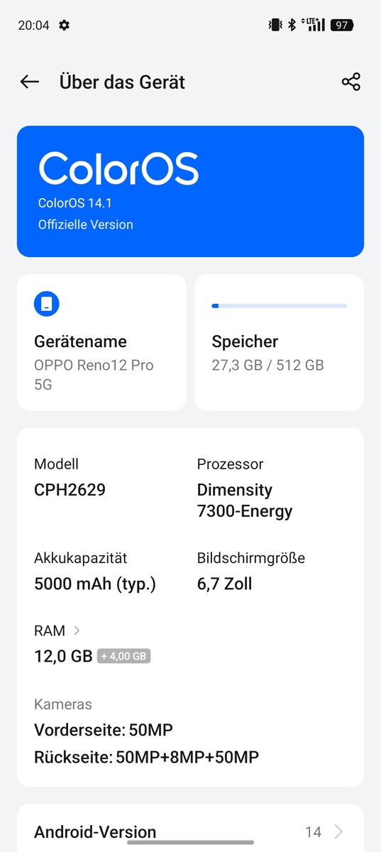 La capacità di memoria di fabbrica è di circa 29 GB. Sono installati molti bloatware, tra cui giochi, Amazon e WPS Office. Tuttavia, questi programmi possono essere eliminati senza problemi. Il produttore intende fornire a Reno12 Pro aggiornamenti del sistema operativo per tre anni e aggiornamenti di sicurezza per quattro anni.