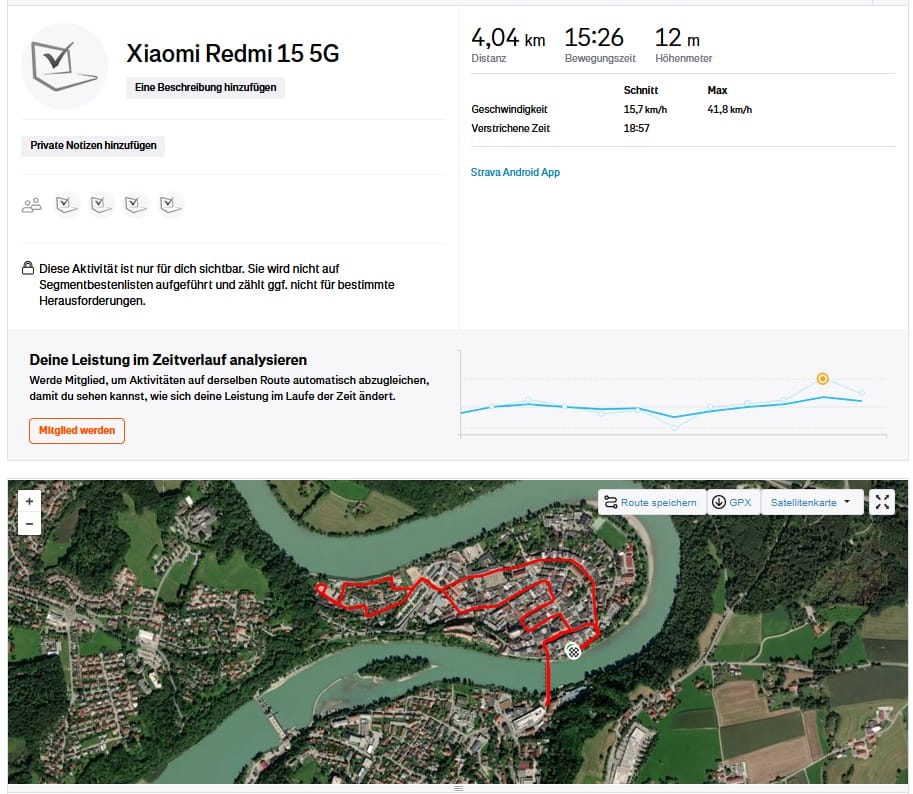Curiosi di scoprire come funziona il posizionamento del Redmi 15 5G nella vita quotidiana, siamo saliti in bicicletta. Durante il viaggio siamo stati accompagnati da Garmin Venu 2, uno smartwatch che di solito fornisce un posizionamento molto preciso.