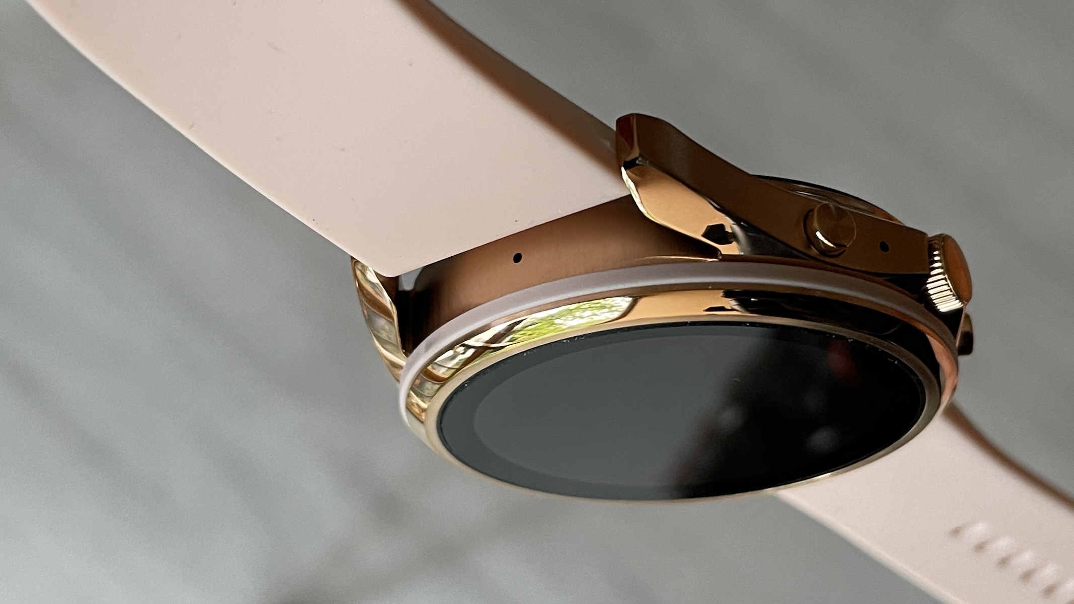 La lunetta girevole è in acciaio inossidabile, e il cinturino della nostra unità di prova è in silicone. Un meccanismo di bloccaggio rapido facilita la sostituzione con qualsiasi altro cinturino da 22 mm (~0.9 in). Un sensore di luminosità offre la regolazione automatica della luminosità dello schermo AMOLED, permettendo di aumentare opzionalmente la luminosità in modo da poter leggere lo schermo dell'orologio anche in piena luce del sole, per esempio. A seconda dell'impostazione scelta, il display si attiva con un gesto quando si alza il braccio, toccando il display o premendo uno dei tre pulsanti sul lato destro. Il pulsante centrale può essere ruotato per scorrere rapidamente le opzioni. I pulsanti attiveranno cinque diverse funzioni in totale, con due di esse configurabili individualmente.