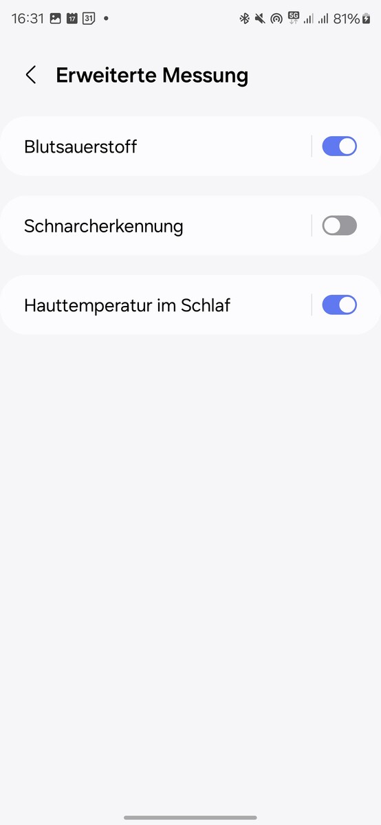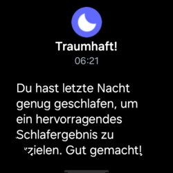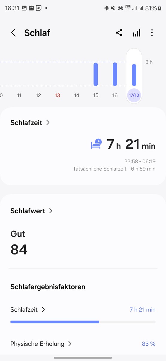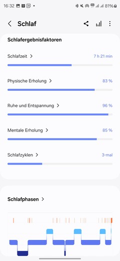Viene valutata anche la qualità del sonno. Samsung fornisce un valore del sonno - un numero compreso tra 0 e 100, che è anche suddiviso in quattro categorie. Il valore del sonno viene anche confrontato con altre persone della stessa fascia d'età. Il punteggio complessivo del sonno dipende da vari fattori, che vengono suddivisi individualmente: Tempo di sonno, recupero fisico, riposo e rilassamento, recupero mentale e cicli del sonno.
