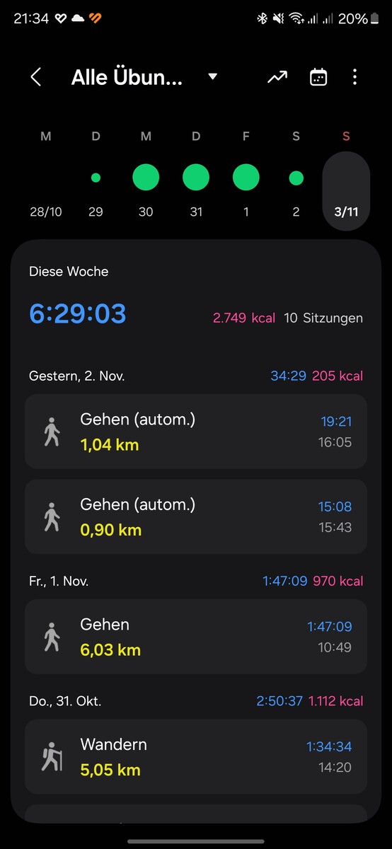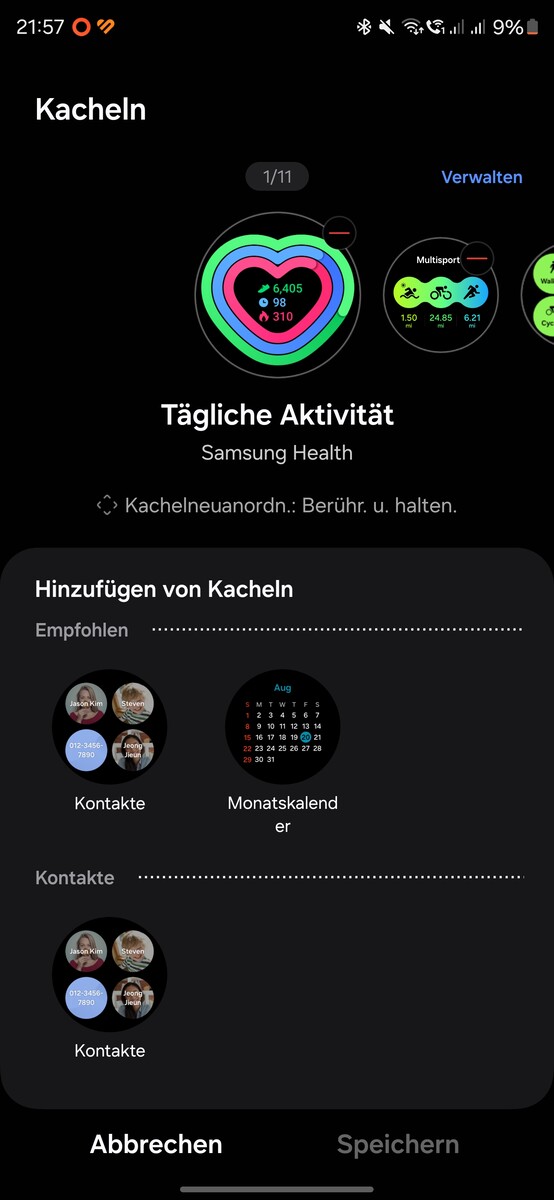 Tutti i dati di fitness, invece, vengono raccolti e visualizzati nell'app Samsung Health. È suddivisa nelle aree "Casa", "Comunità", "Fitness" e "Profilo". la "Home" è un cruscotto che mostra tutti i dati raccolti in piastrelle. Facendo clic su un riquadro si apre un sottomenu corrispondente. Il contenuto e l'ordine possono essere personalizzati.