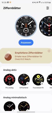 L'app Galaxy-Wear ha un'interfaccia chiara; c'è un solo cruscotto con collegamenti alle varie impostazioni. La schermata dell'app, le piastrelle e il menu breve possono essere organizzati individualmente. Samsung offre anche un'ampia gamma di watch face gratuite.