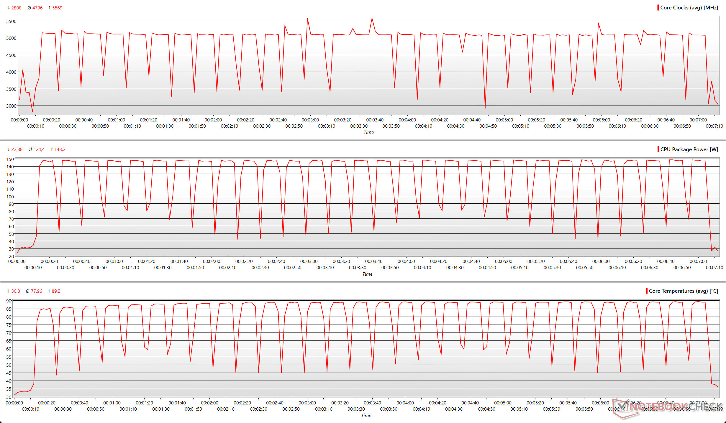 Durante un'esecuzione multi-core a 30 loop di Cinebench R15, Ryzen 7 9850X3D sale a 5,57 GHz, raggiungendo una potenza di picco di 148 W e una temperatura massima del core di 89 °C.