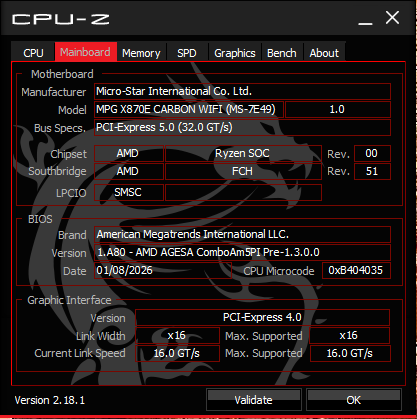 - Scheda madre MSI MAG X870E Carbon Wi-Fi con BIOS 1.A80 (AGESA ComboAM5PI Pre-1.3.0.0)