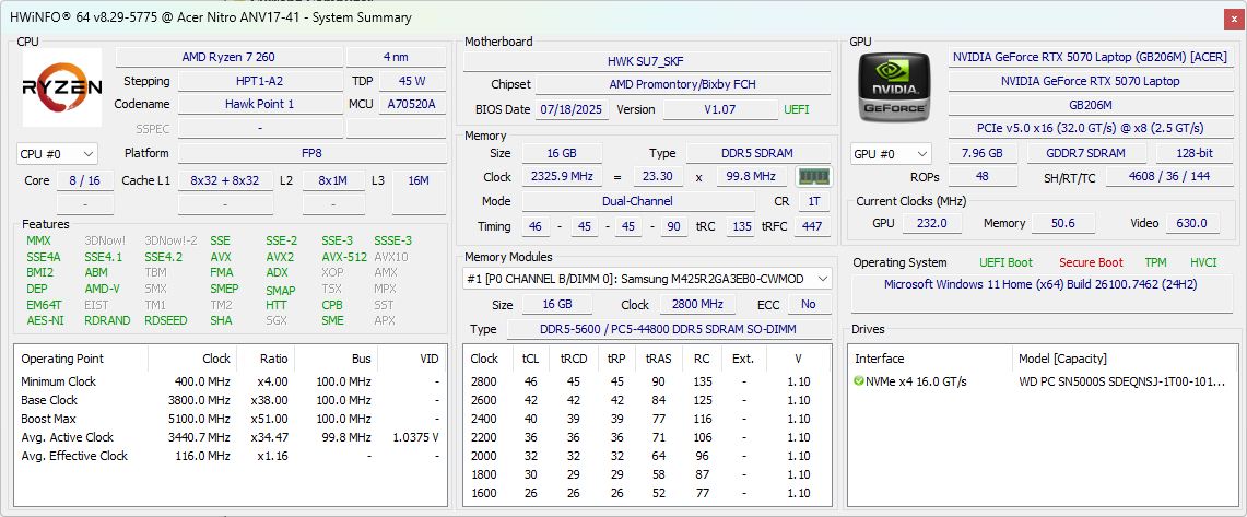 | Acer Nitro v 17 (ANV17-41-R4CJ) AMD Ryzen 7 260 ⎘ NVIDIA GeForce RTX 5070 Laptop ⎘ 16 GB Memoria, 1024 GB SSD | Prezzo di listino: 1199 Euro | 2.7 kg | 24 mm | 17.30" 1920x1080 127 PPI IPS | |
