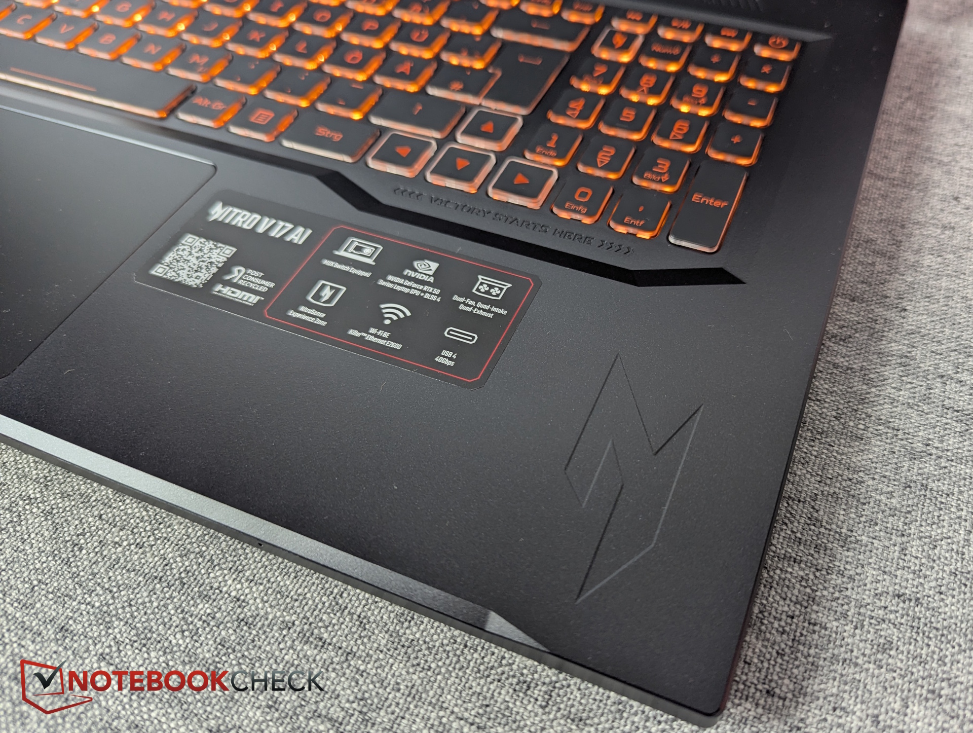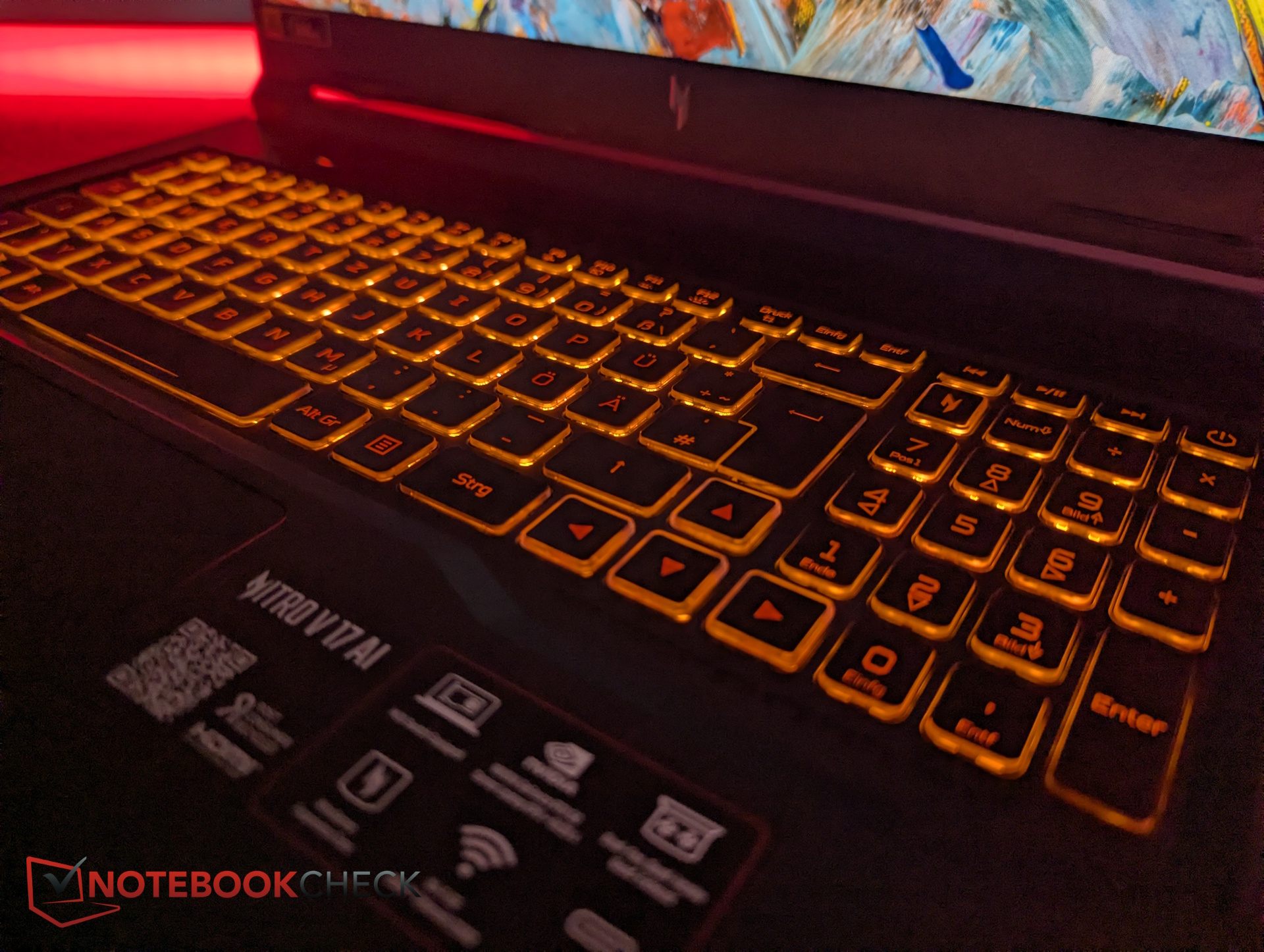 Nonostante lo chassis da 17 pollici, i tasti del tastierino numerico sono notevolmente piccoli. Le etichette dei tasti sono stampate in arancione, con un contrasto debole. C'è un tasto NitroSense dedicato e la retroilluminazione della tastiera RGB è limitata a una sola zona.