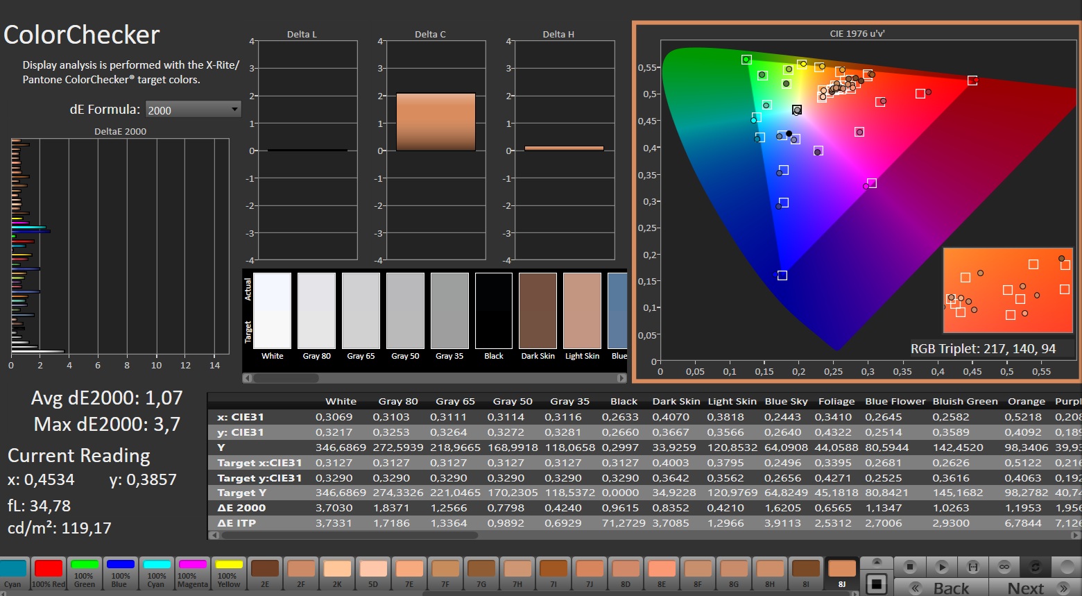 | Colorchecker dE 2000 * | 1.07 | 5.82 -444% | 4.7 -339% | 1.33 -24% | 0.9 16% | 2.29 -114% | 1.7 -59% |
