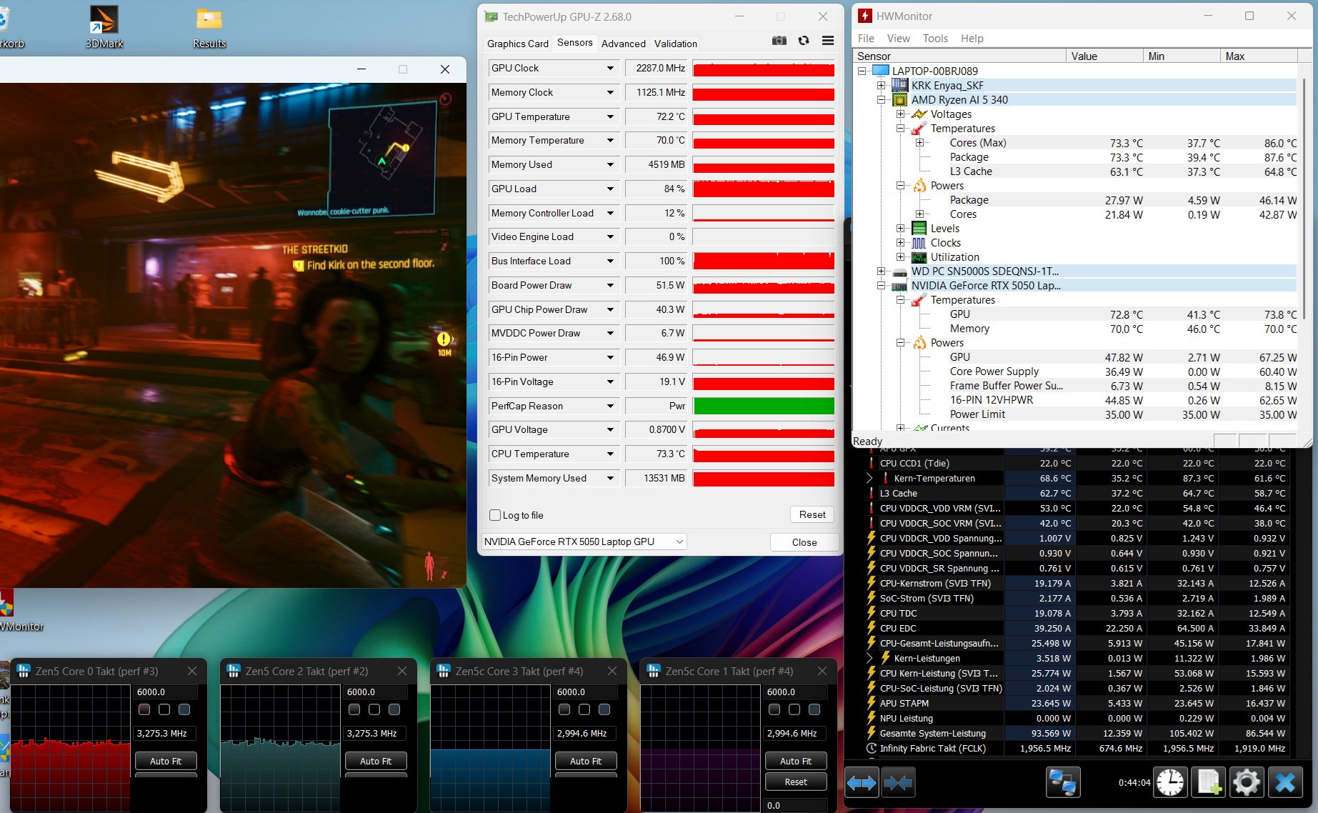 | Cyberpunk 2077 ultra external monitor * (Watt) | 94.6 | 129.6 -37% | 126.7 -34% | 151.1 -60% | 165 -74% | 165 -74% | 168.6 -78% | |