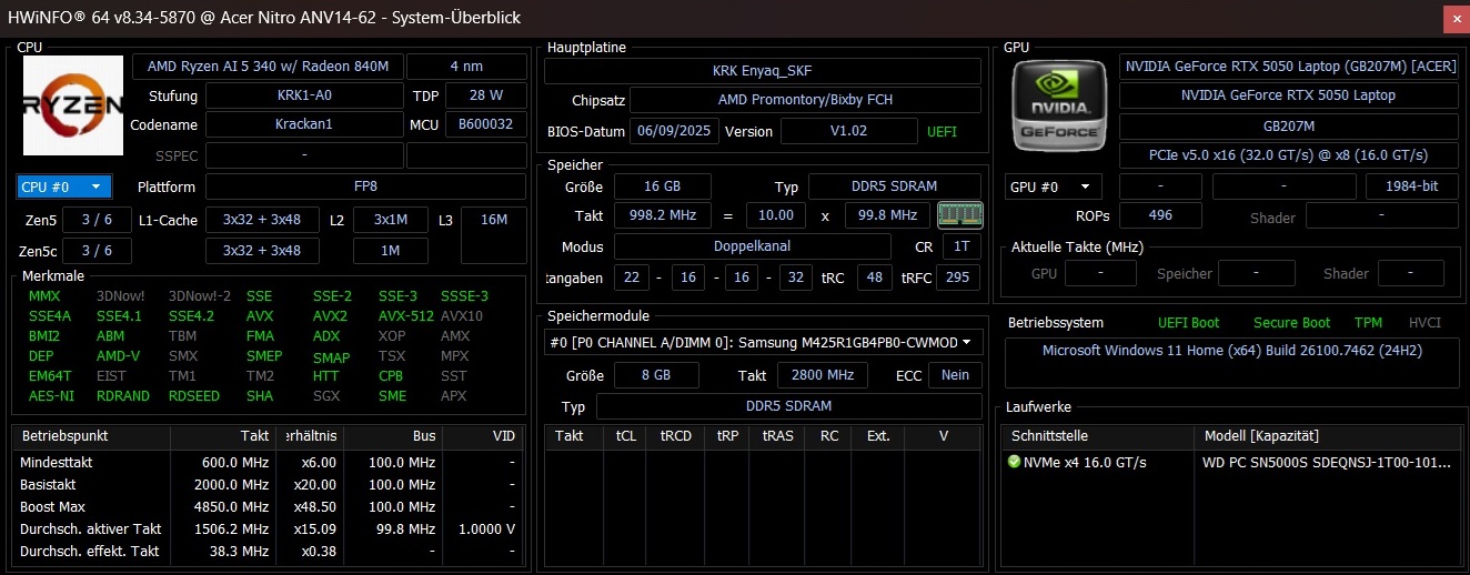 | Acer Nitro V14 AI ANV14-62-R9LT AMD Ryzen AI 5 340 ⎘ NVIDIA GeForce RTX 5050 Laptop ⎘ 16 GB Memoria, 1024 GB SSD | Prezzo di listino: 1150 EUR | 1.7 kg | 21.9 mm | 14.50" 1920x1200 156 PPI IPS | |