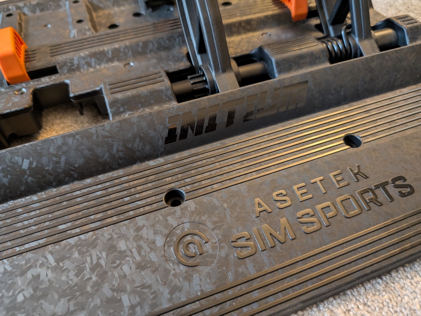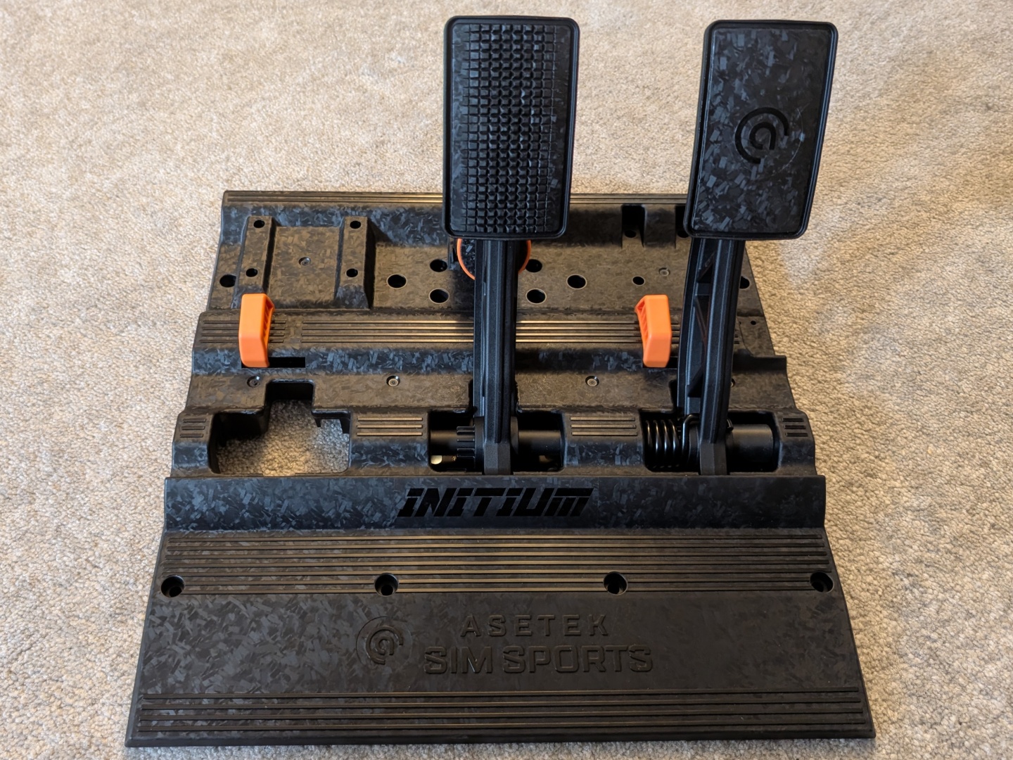 Per quanto riguarda i pedali, Asetek ha portato i suoi insegnamenti dai kit premium nel kit pedali Initium. Ci sono l'acceleratore e il freno, con spazio per il pedale della frizione. Entrambi utilizzano i sensori di Hall per l'input e il pedale del freno ha un'attuazione a molla in due fasi. I pedali hanno anche una modalità 'Cockpit' e una modalità 'Floor' che consente di cambiare l'angolo dell'acceleratore e del freno, a seconda dell'utilizzo. La pedaliera è realizzata in materiale composito rinforzato con fibra di vetro e la finitura è davvero ottima.