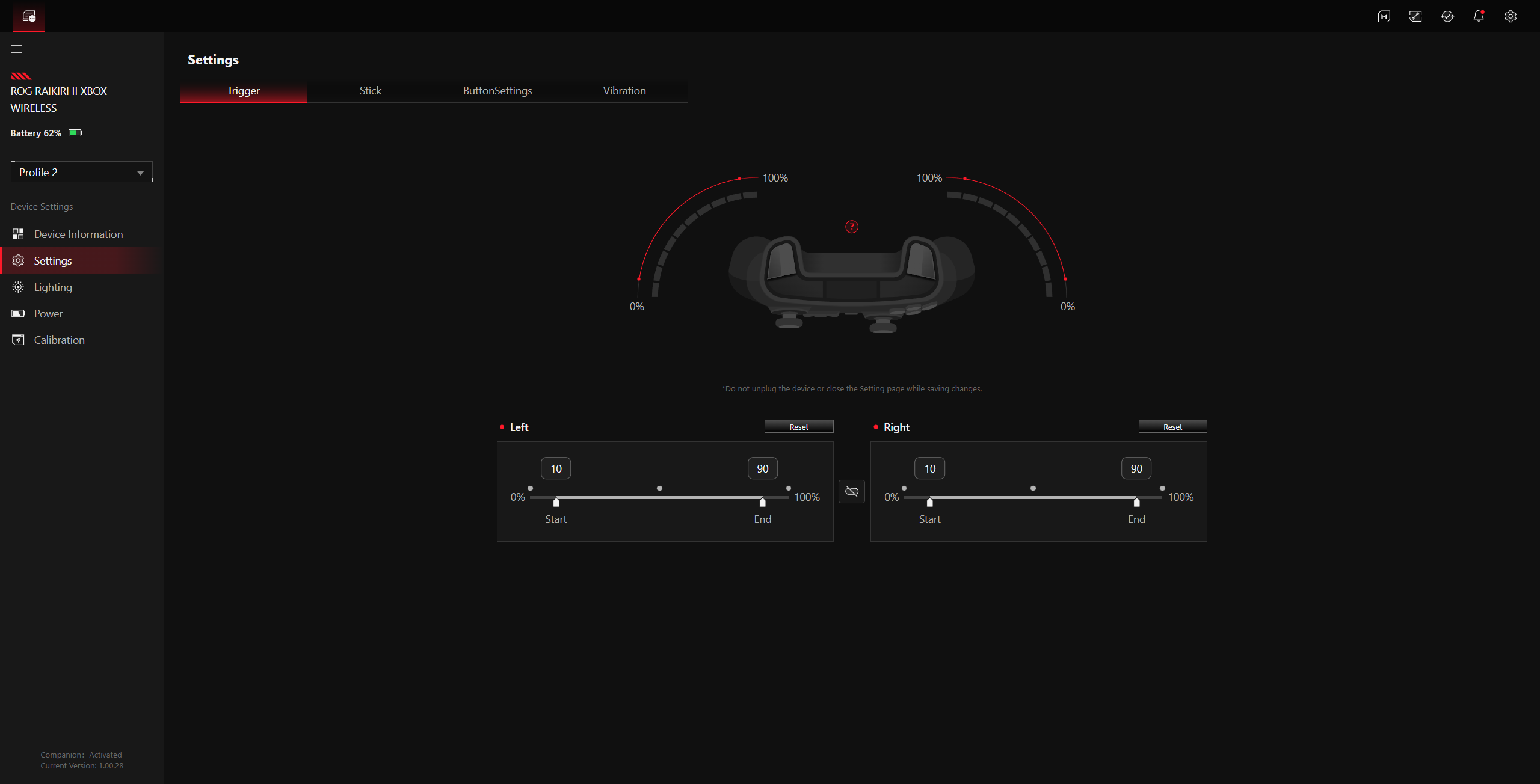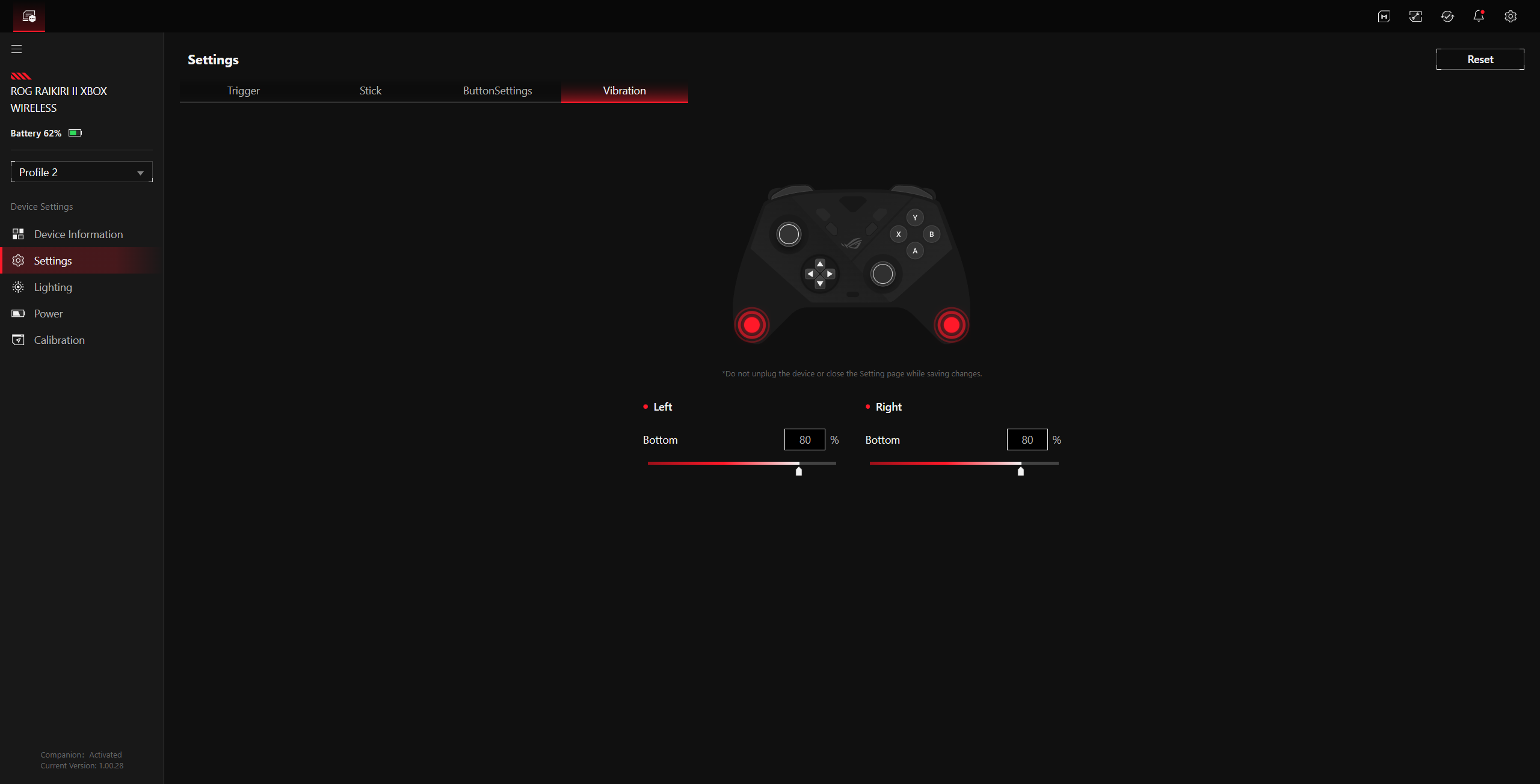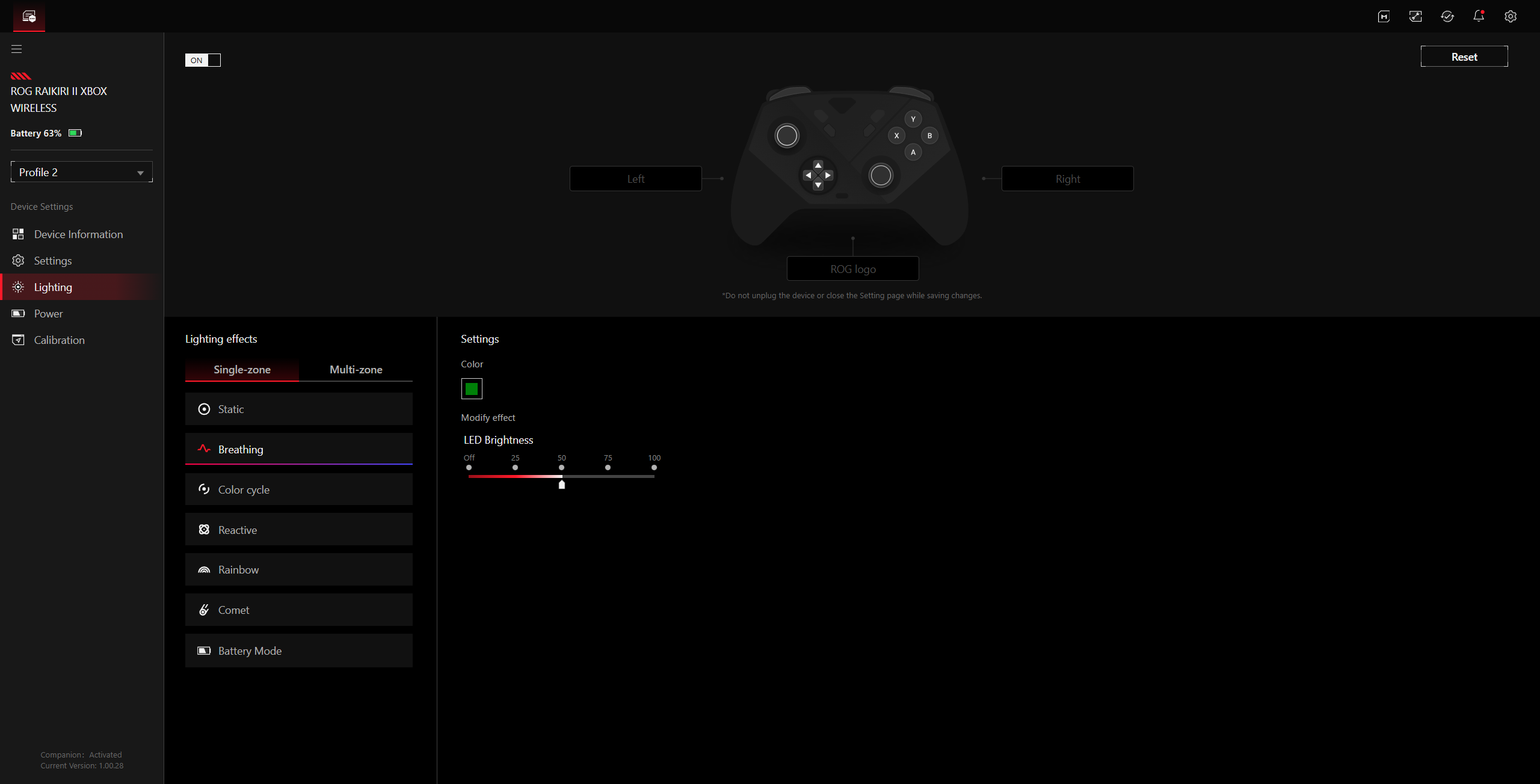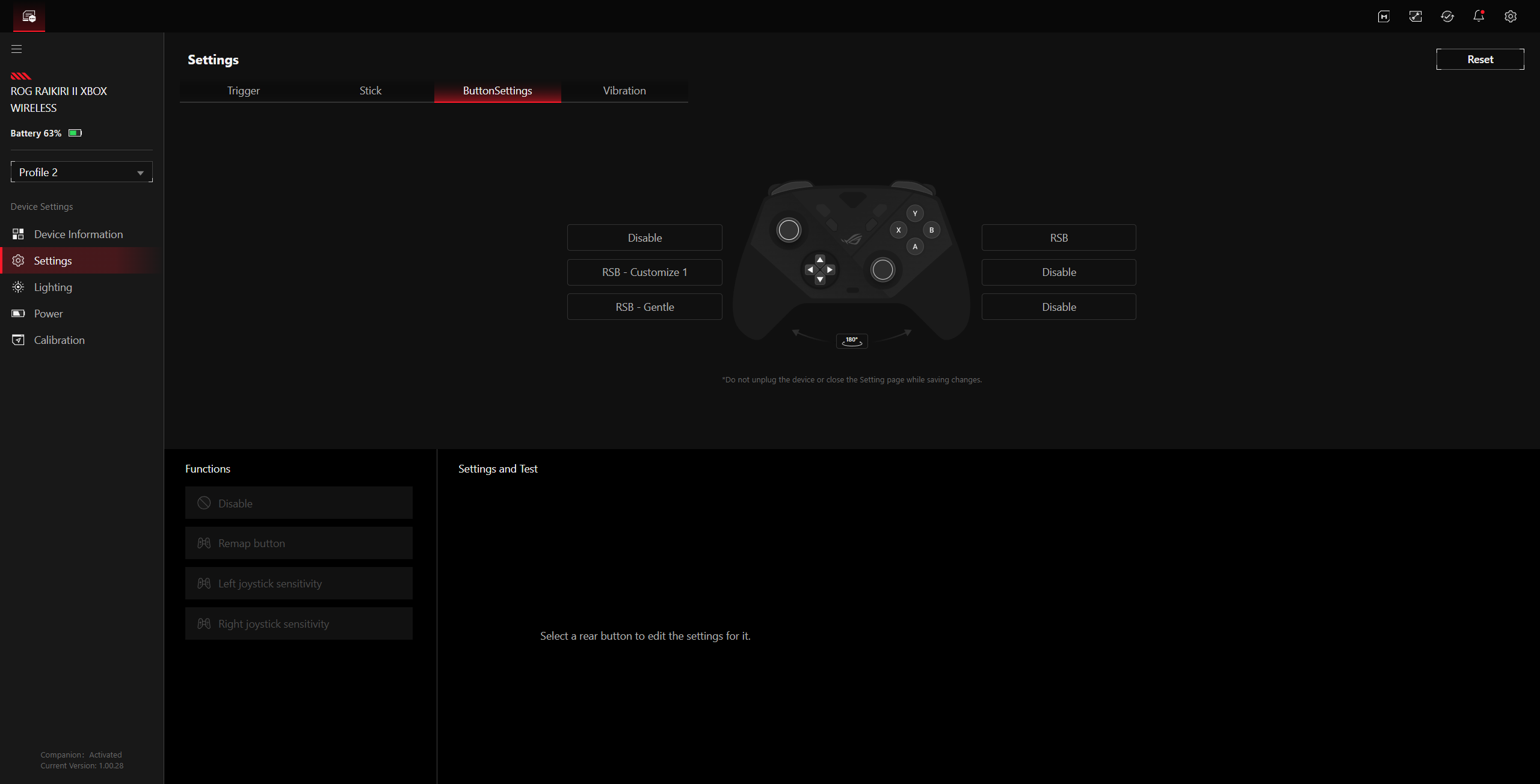 L'intensità della vibrazione può essere regolata separatamente per i due motori di vibrazione e l'illuminazione RGB può essere configurata in tre zone (sinistra, destra e il logo ROG). La commutazione tra i cinque profili avviene tramite una combinazione di tasti (Coppia + Y). Inoltre, le curve del joystick possono essere modificate con la pressione di un pulsante e indipendentemente dal profilo attivo, purché si tenga premuto il pulsante, in modo simile al pulsante sniper di un mouse. Negli sparatutto, questo può essere utile per passare dalle armi montate sui veicoli, al gioco normale e al cecchinaggio.