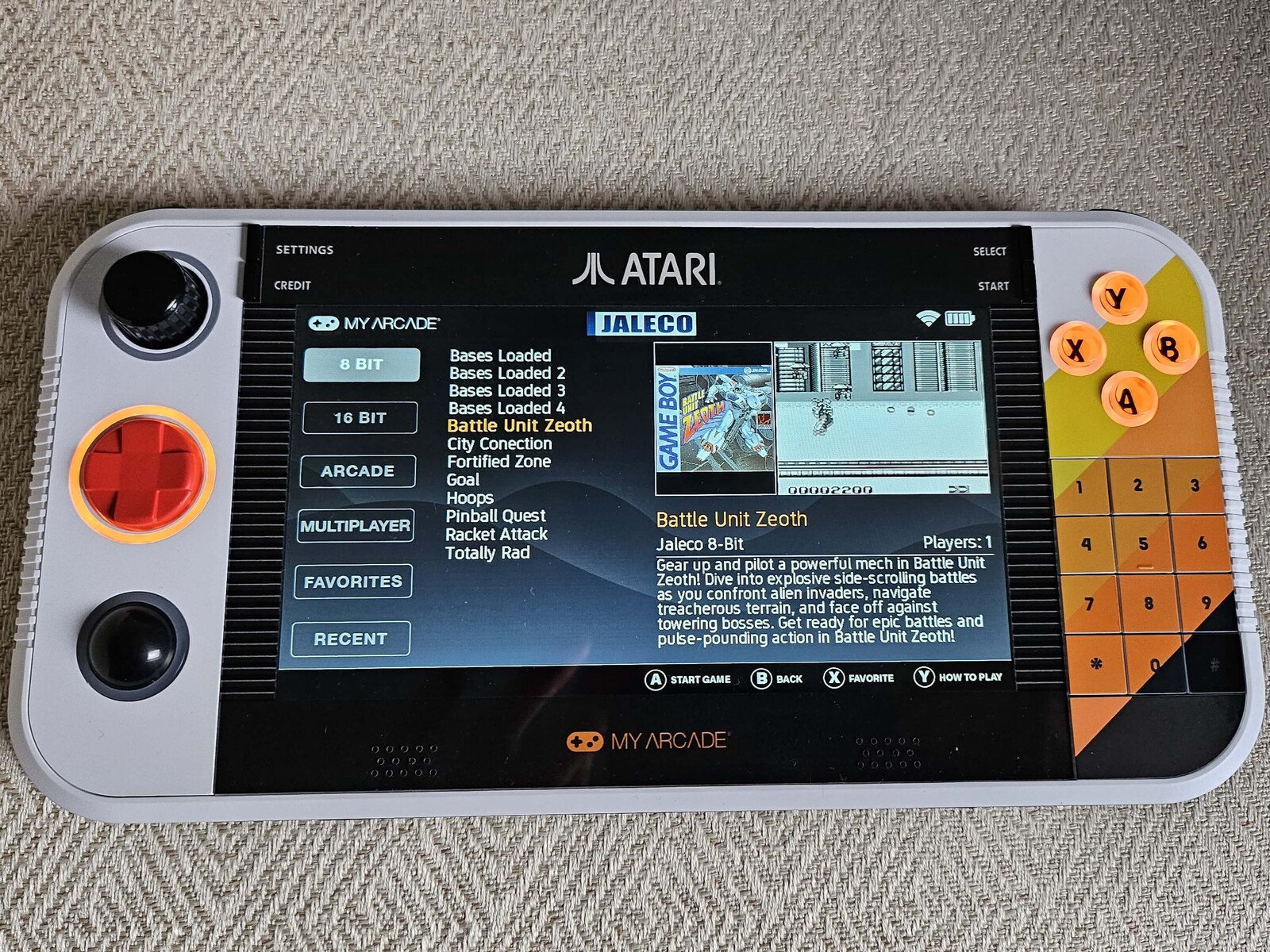 I 200 giochi integrati si rivolgono a un'ampia gamma di giocatori e offrono davvero qualcosa per tutti. Oltre ai titoli di Atari, il sistema include diversi giochi di Piko e Jaleco, anche se non è chiaro perché siano state scelte queste particolari selezioni. Ogni titolo viene visualizzato nel menu con la sua copertina originale - ad esempio, la versione per Game Boy di Battle Unit Zeoth - insieme a un breve video di riproduzione automatica e a una descrizione in inglese. Il menu principale è suddiviso in categorie come Atari Recharged, Atari, Balls of Steel, Pac-Man, Jaleco, Piko e Impostazioni. I sottomenu organizzano ulteriormente la libreria in 8-bit, 16-bit, Arcade, Multiplayer, Preferiti e Giocati di recente. Chi ha familiarità con frontend come RetroArch o Retro Deck si sentirà a casa: tutto è strutturato in modo ordinato e si avvia rapidamente.