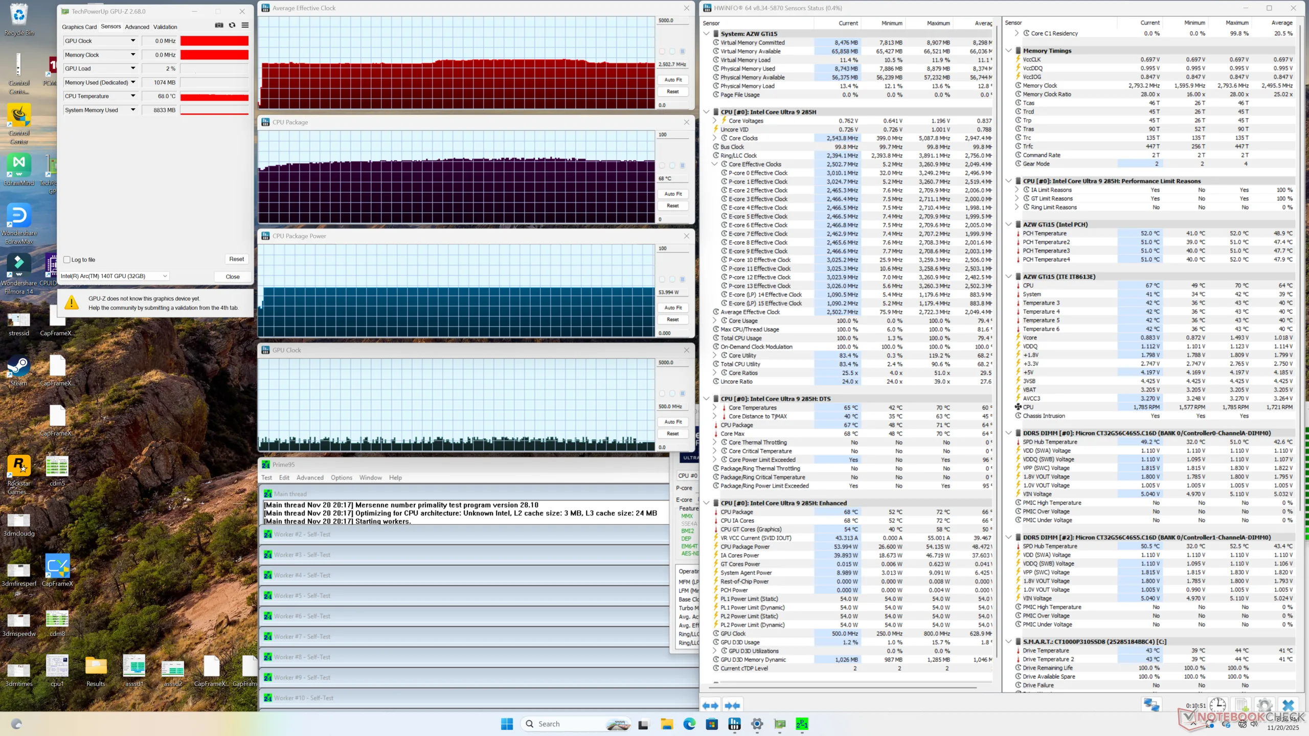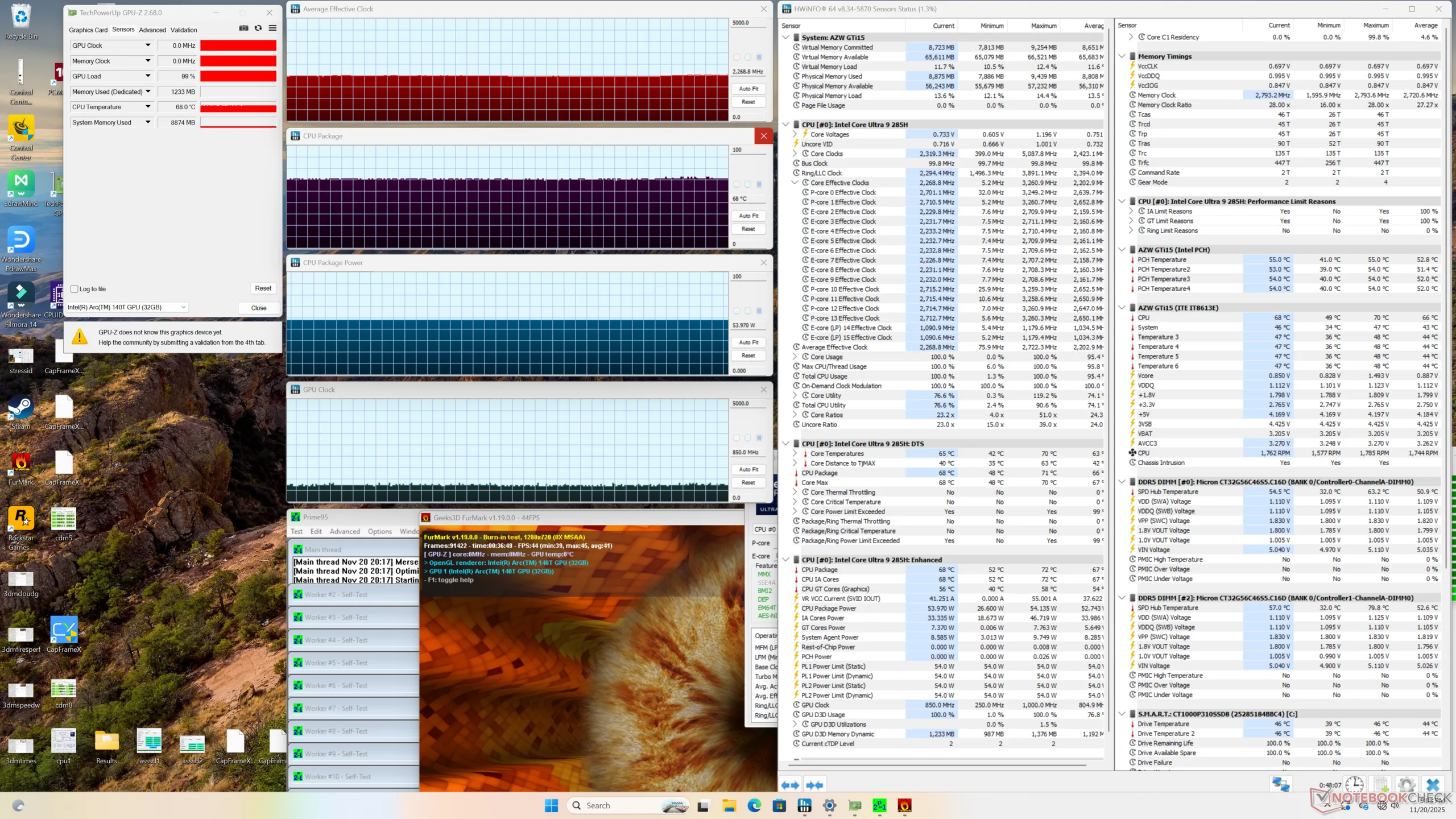 | Prime95 + FurMark Stress | 2,3 | 850 | 68 |