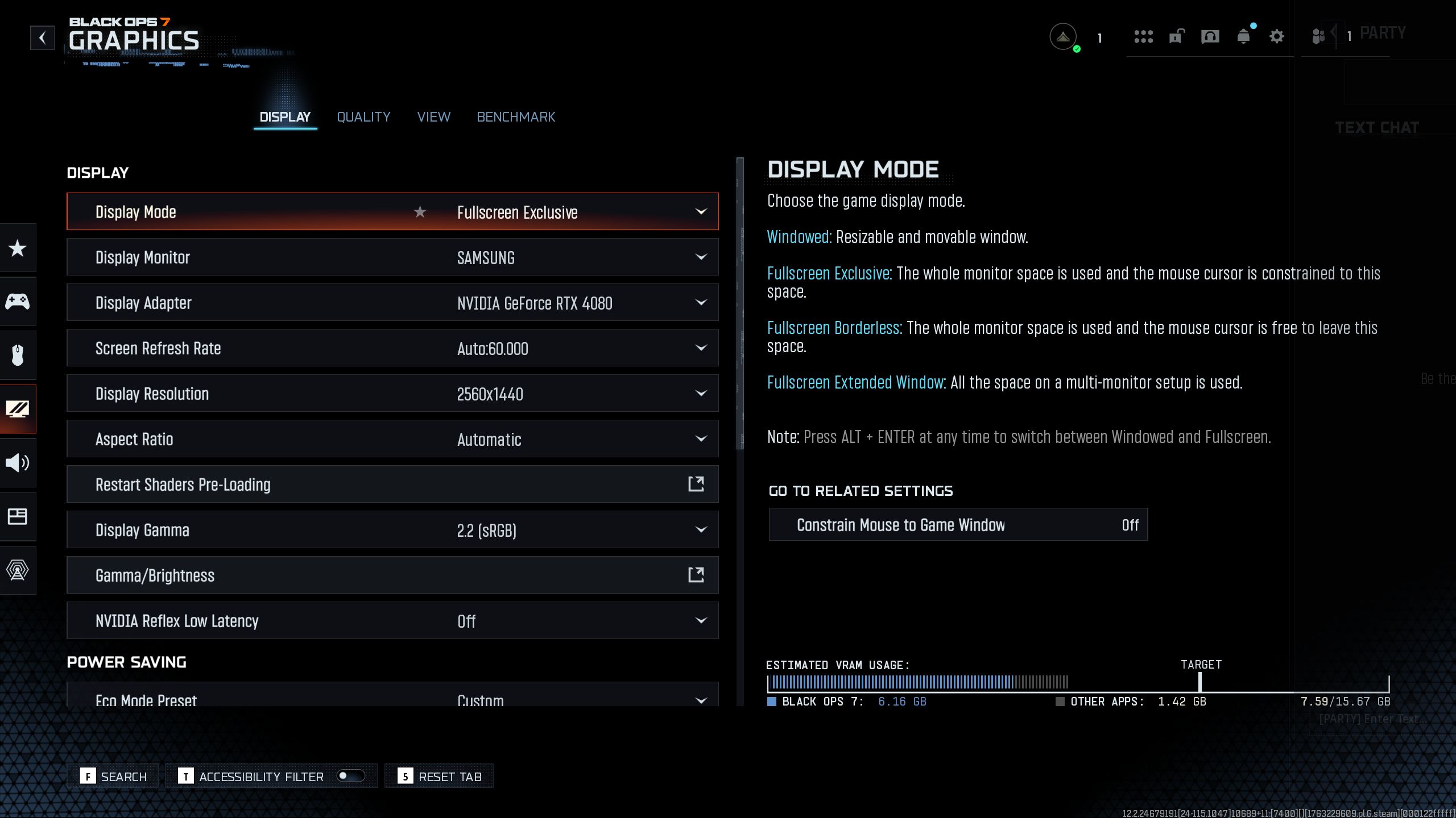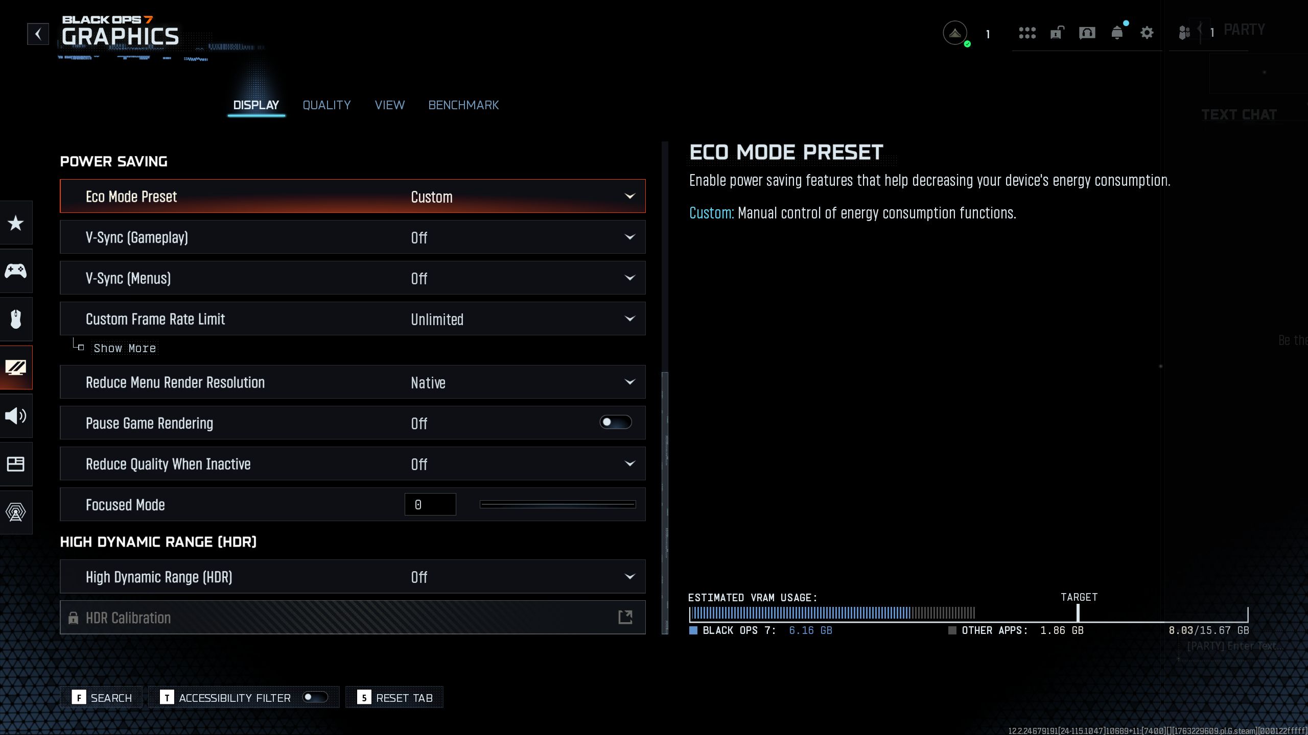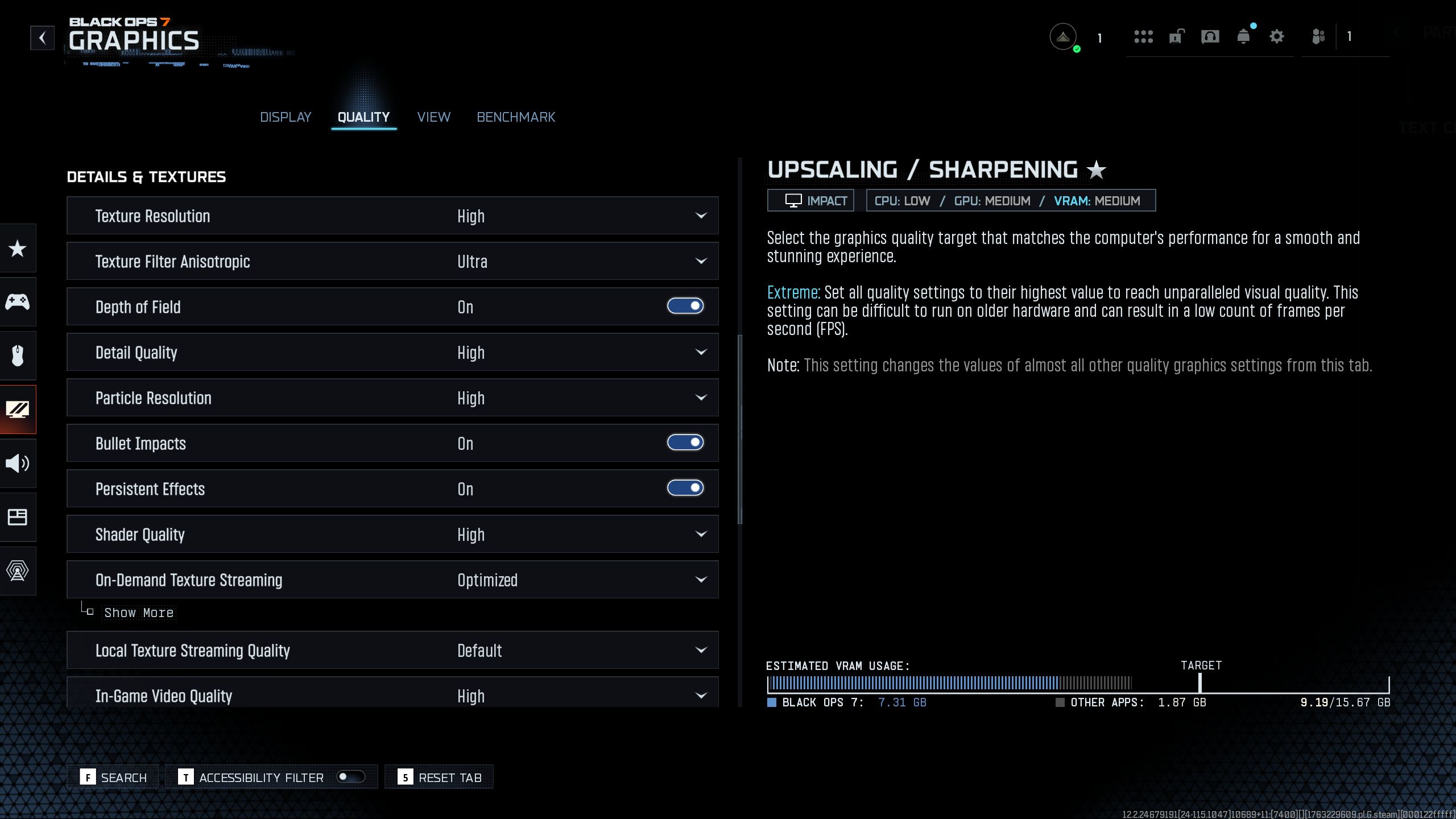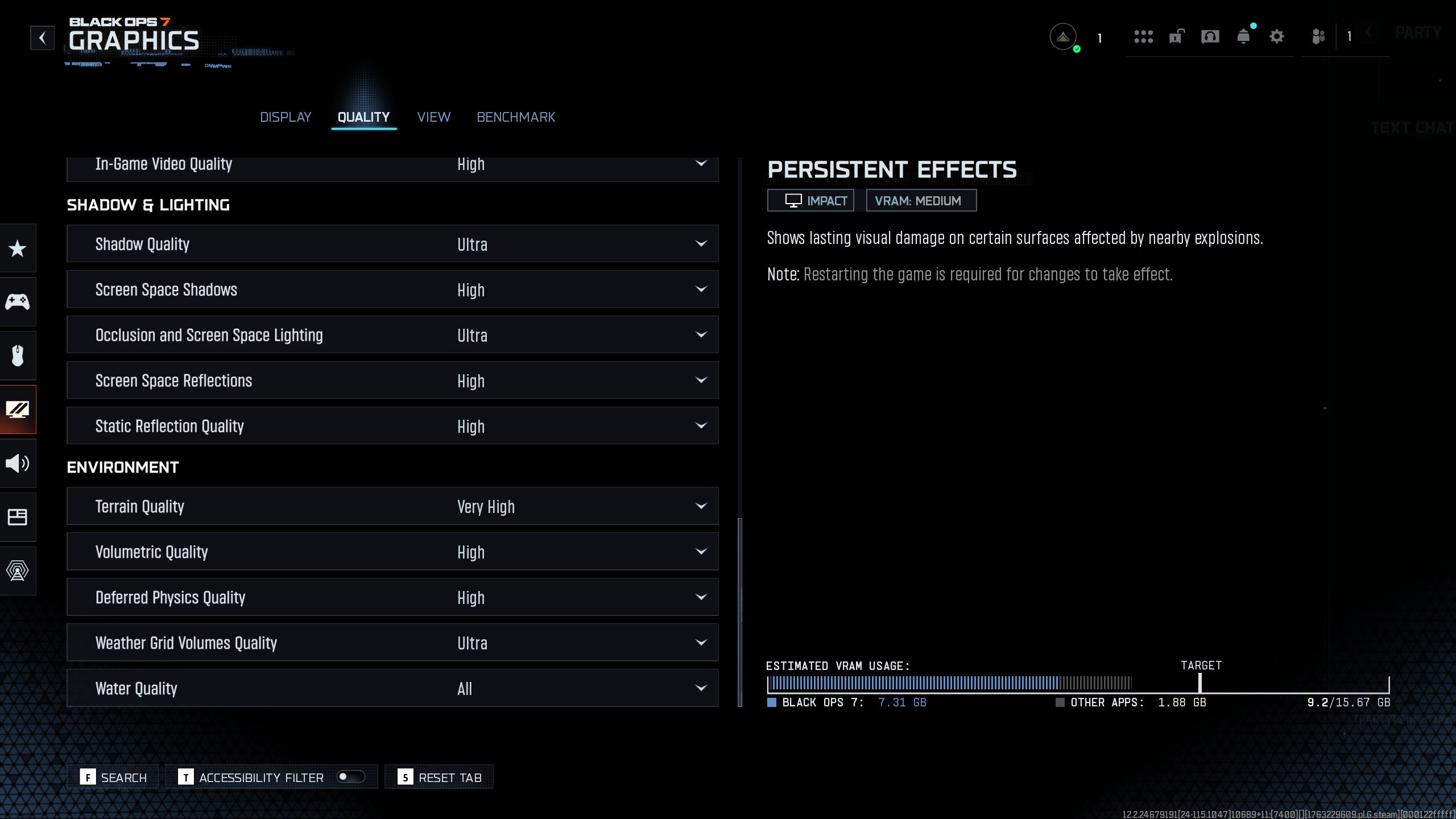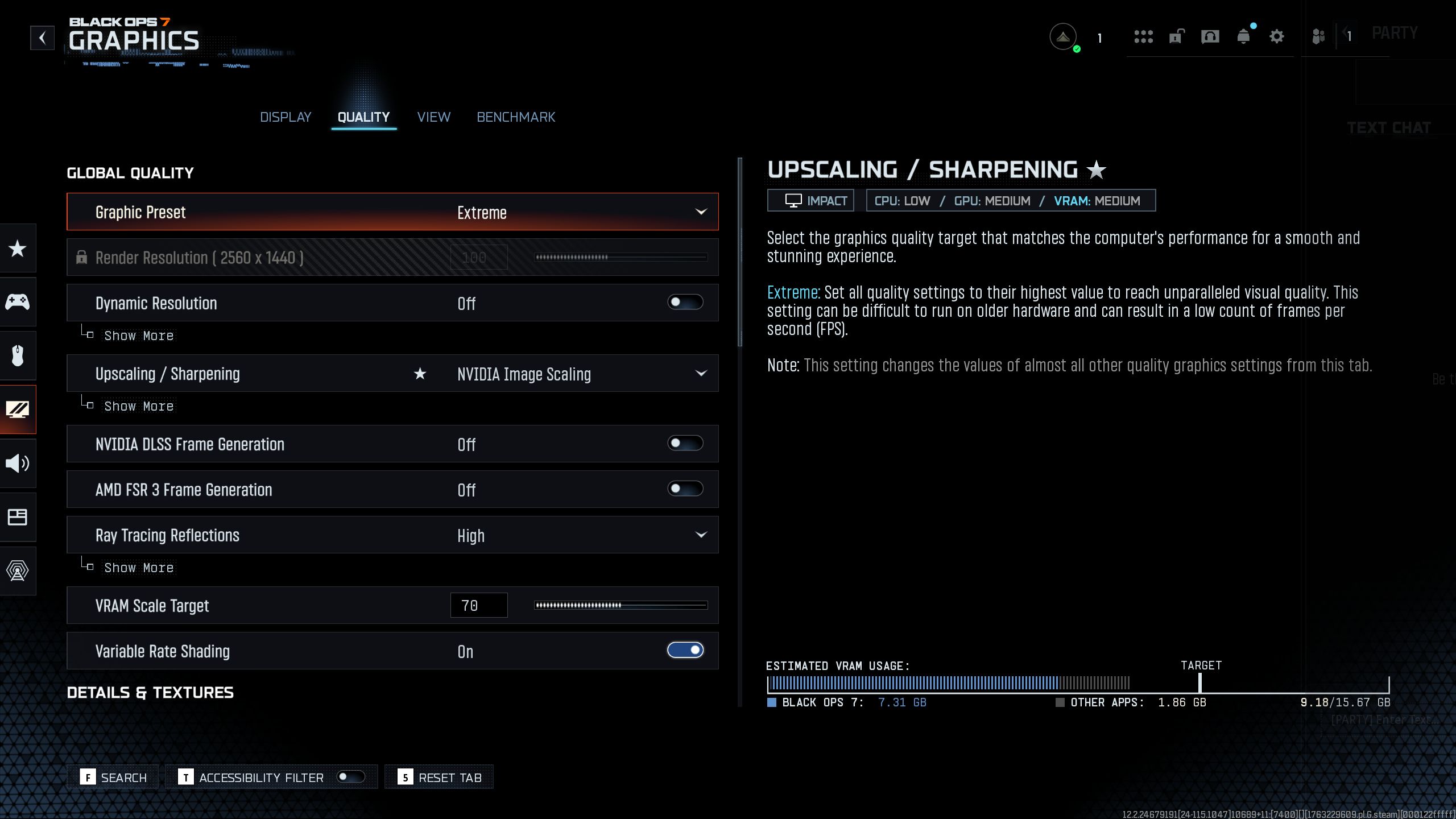 Come la maggior parte dei giochi attuali, Call of Duty: Black Ops 7 è piuttosto affamato di VRAM, senza raggiungere il livello di alcuni giochi Unreal Engine 5 (vedi Borderlands 4). Ad esempio, le impostazioni massime alla risoluzione QHD richiedono circa 8 GB di VRAM. La parte migliore è che le modifiche alle impostazioni vengono applicate direttamente senza riavviare.