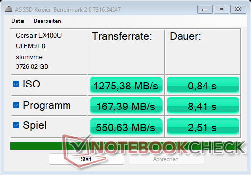 Abbiamo misurato le prestazioni del supporto di archiviazione esterno su vari dispositivi. Utilizzando l'Asus Zenbook OLED con il veloce Intel Core Ultra 9 288V, abbiamo ottenuto eccellenti valori di prestazioni che addirittura superano di poco le specifiche per la lettura sequenziale (test diskspd). Il Corsair si comporta in modo eccezionale nei test sintetici di lettura e scrittura e non delude nemmeno negli altri test sintetici. Nel benchmark AS SSD Copy, tuttavia, le prestazioni sono chiaramente inferiori a quelle delle veloci SSD integrate.