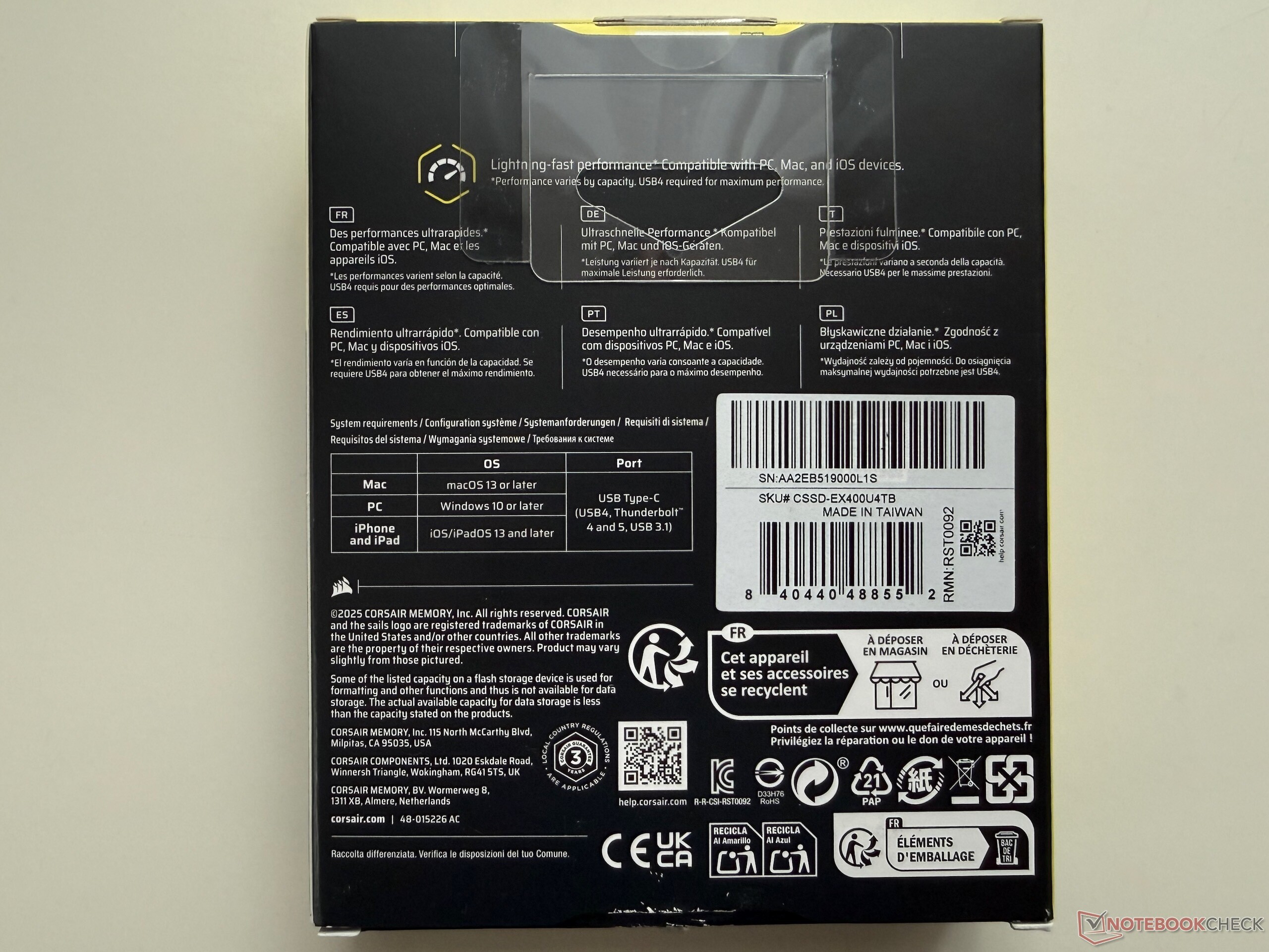Il Corsair EX400U 4TB (CSSD-EX400U4TB) è alimentato dal controller Phison PS2251, che offre il supporto USB nativo. Secondo Corsair, i chip di memoria TLC NAND utilizzati sono di Kioxia. L'SSD offre una garanzia di 3 anni, a condizione che non venga superato il TBW (Tobal Bytes Written) di 1.000 terabyte (per il modello da 4TB). Come caratteristica speciale, l'SSD offre un anello MagSafe sul retro. Ciò consente di collegare l'SSD a tutti gli iPhone attuali e, ad esempio, di scrivere ProRes direttamente sull'SSD dell'iPhone 16 Pro nel test.