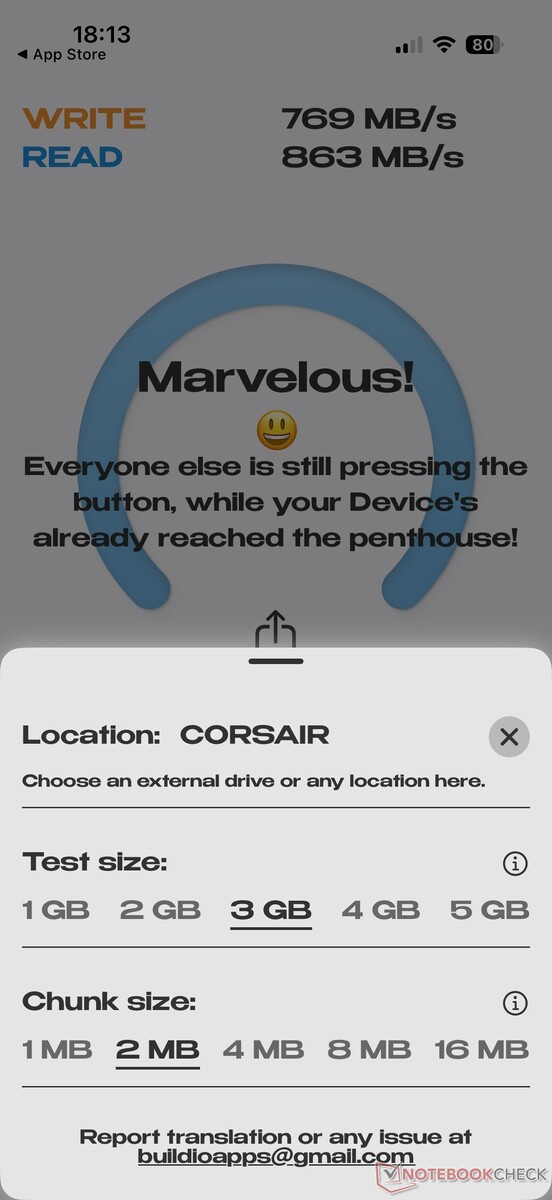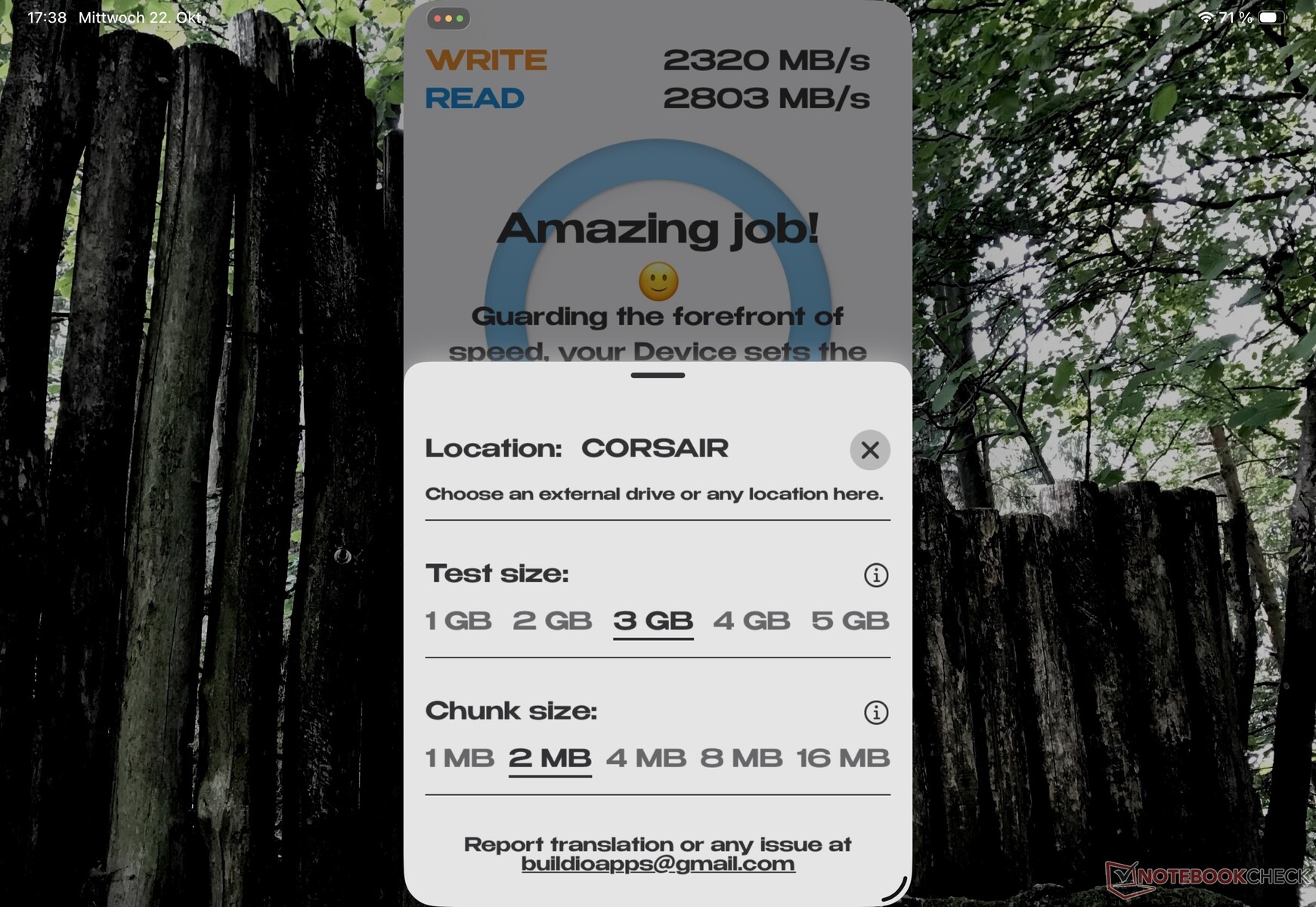 Utilizzando un iPad Pro (M4 dal 2024 con SSD di base da 256 GB) le prestazioni dell'SSD Corsair sono impressionanti. Le prestazioni di lettura più che raddoppiate e le prestazioni di scrittura più veloci del 66% parlano da sole. Tuttavia, non si avvicina ai 4.000 MB/s massimi. L'iPhone 16 Pro è una storia diversa, poiché la porta USB consente prestazioni significativamente inferiori. L'EX400U raggiunge solo 860 / 770 MB/s (lettura / scrittura). Tuttavia, almeno in scrittura, è leggermente più veloce dell'SSD interno da 128 GB.