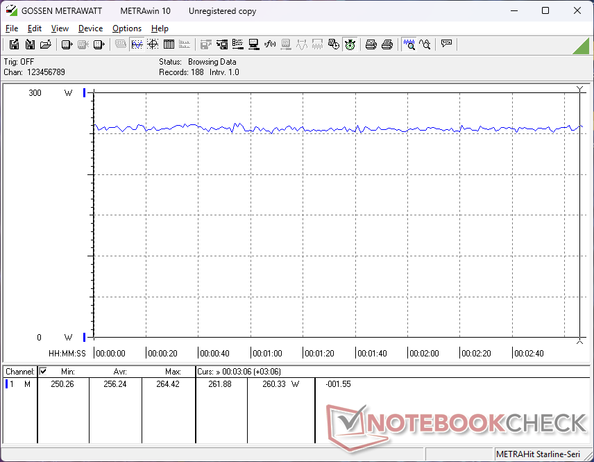 L'esecuzione di carichi impegnativi come Cyberpunk 2077 richiede quasi 260 W dall'adattatore CA USB-C da 280 W (~16,2 x 7,8 x 2,3 cm). Si aspetti che la velocità di ricarica sia molto lenta se si eseguono carichi impegnativi contemporaneamente. In confronto, l'HP ZBook Fury G1i 18 viene fornito con un adattatore CA da 330 W più ingombrante, per prestazioni massime potenzialmente più elevate e tassi di ricarica più rapidi.