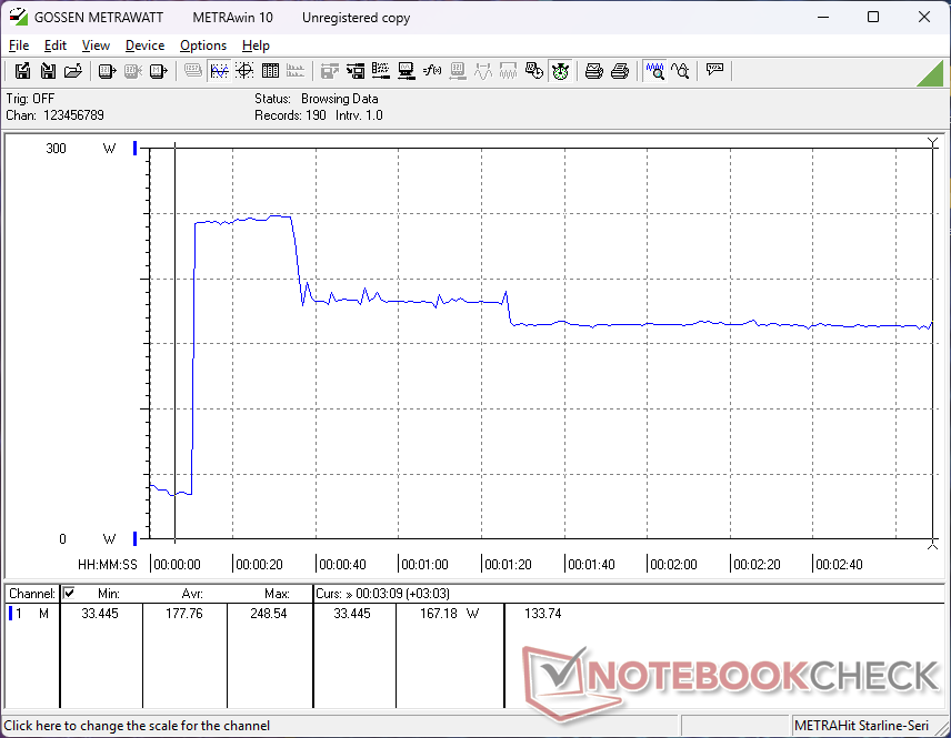 Il funzionamento al minimo può assorbire da un minimo di 6 W a un massimo di 32 W se si utilizza l'impostazione di luminosità massima con la GPU discreta attiva. Questo valore minimo è inferiore a quello della maggior parte degli altri portatili da 18 pollici, il che spiega la durata relativamente lunga della batteria nella sezione successiva.
