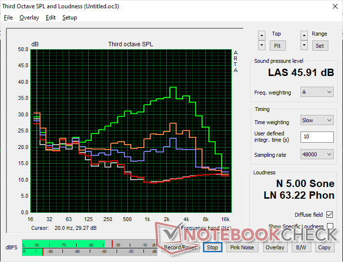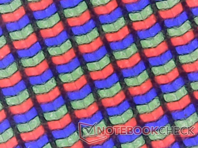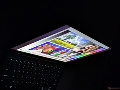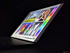 Rispetto al pannello OLED, il pannello IPS meno costoso può essere leggermente più luminoso al centro, ma altrimenti leggermente più debole ai bordi e agli angoli a causa di una minore uniformità. Il rapporto di contrasto è comunque molto buono, soprattutto per un pannello IPS, con oltre 2000:1 e mentre Windows VRR è supportato fino a solo 1 Hz quando è al minimo, rispetto ai 20 Hz o più della maggior parte degli altri computer portatili. Si noti che questa funzione è disattivata per impostazione predefinita e deve essere attivata manualmente.