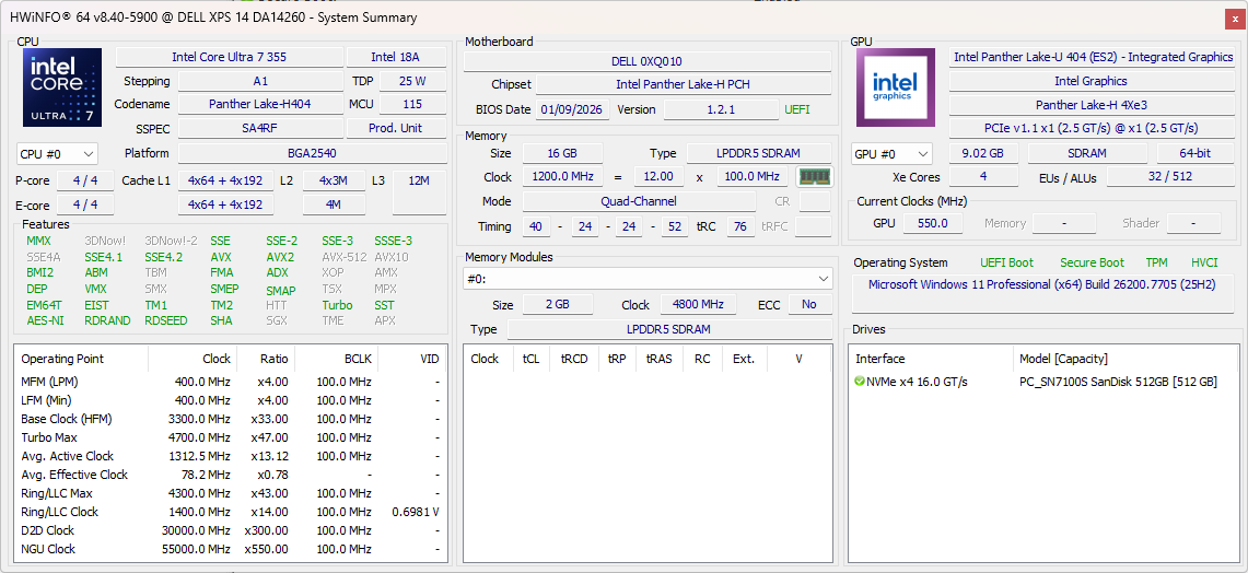 | Dell XPS 14 Core Ultra 7 355 Intel Core Ultra 7 355 ⎘ Intel Graphics 4 Xe3 Panther Lake iGPU ⎘ 16 GB Memoria, 512 GB SSD | Amazon: Prezzo di listino: 1600 USD | 1.5 kg | 15.2 mm | 14.00" 1920x1200 162 PPI IPS | |