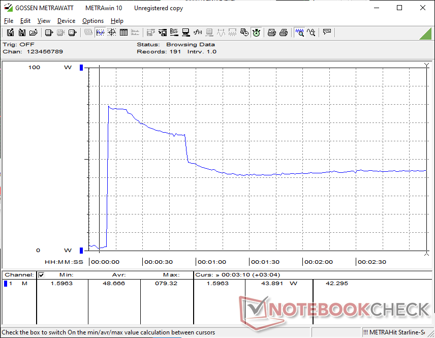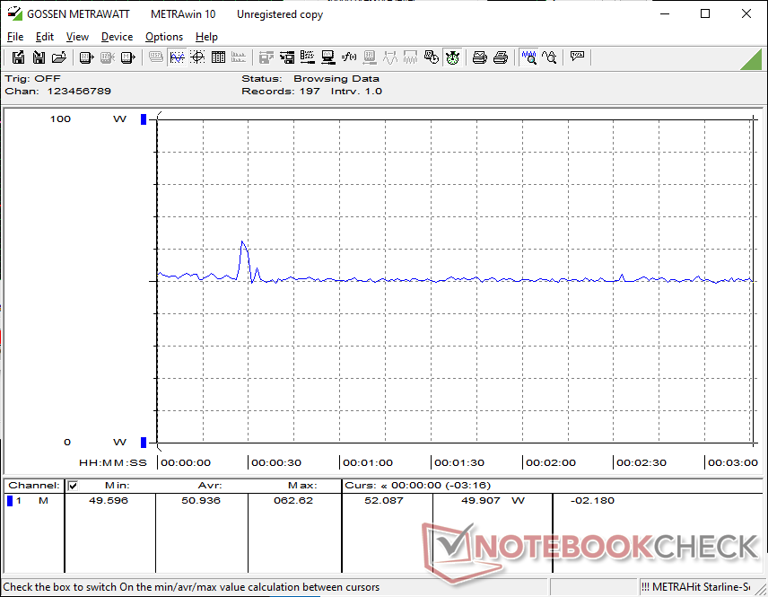 L'adattatore universale USB-C da 100 W è identico in tutte le configurazioni di XPS 14 2026. Poiché il potenziale Turbo Boost è inferiore sul Core Ultra 7, tuttavia, siamo in grado di raggiungere solo un consumo massimo di 80 W quando la CPU è completamente stressata, rispetto ai 101 W della configurazione Core Ultra X7.