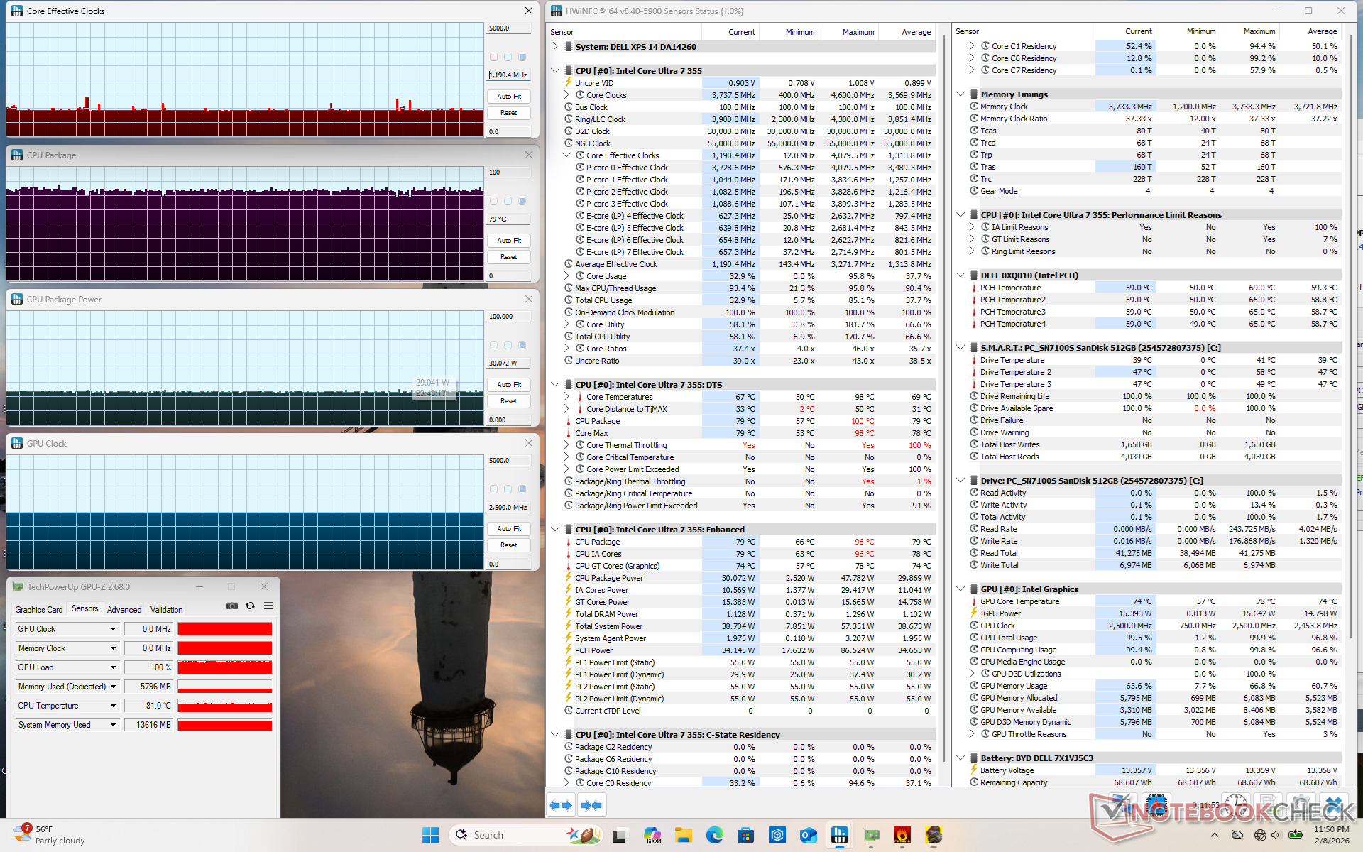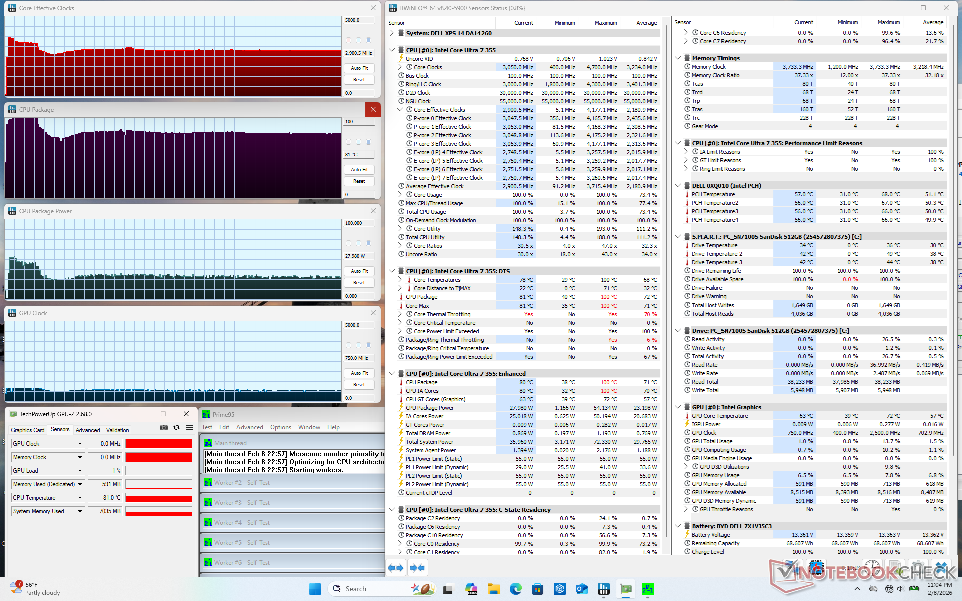 Quando si esegue lo stress Prime95, la CPU sale a 3,7 GHz e 54 W per pochi secondi a 100 C. In seguito, si stabilizza a 2,9 GHz, 28 W e 81 C per rappresentare il potenziale limitato del Turbo Boost. La temperatura del core si stabilizzava nella fascia bassa degli 80 C quando si eseguivano carichi impegnativi, leggermente più fredda di quella che abbiamo registrato sul modello Arrow Lake-H dello scorso anno Dell 14 Premium.
