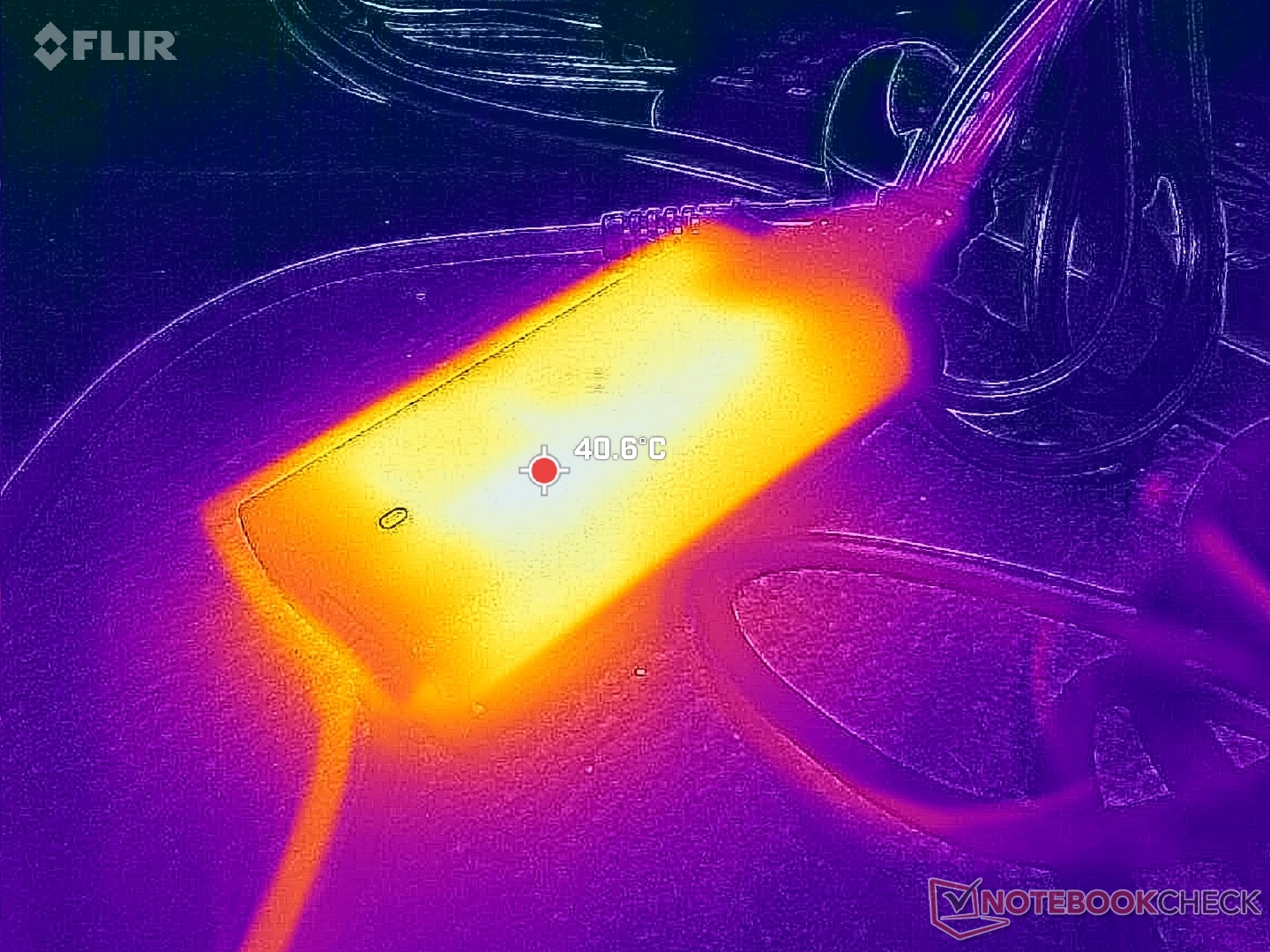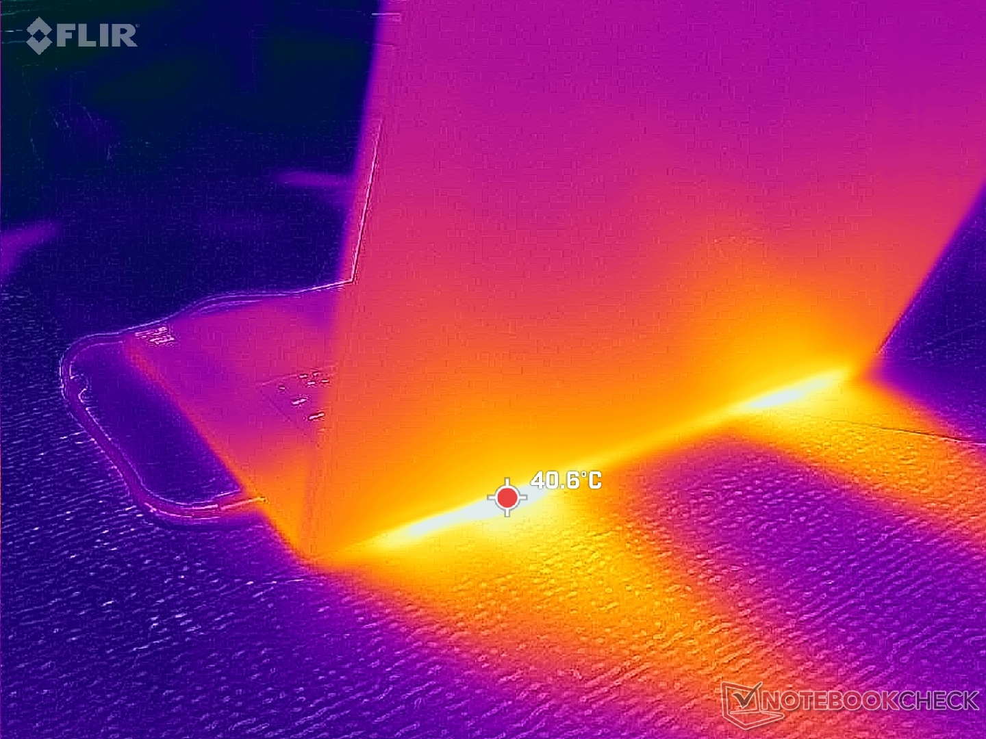 (+) Il lato inferiore si riscalda fino ad un massimo di 39.8 °C / 104 F, rispetto alla media di 39.1 °C / 102 F