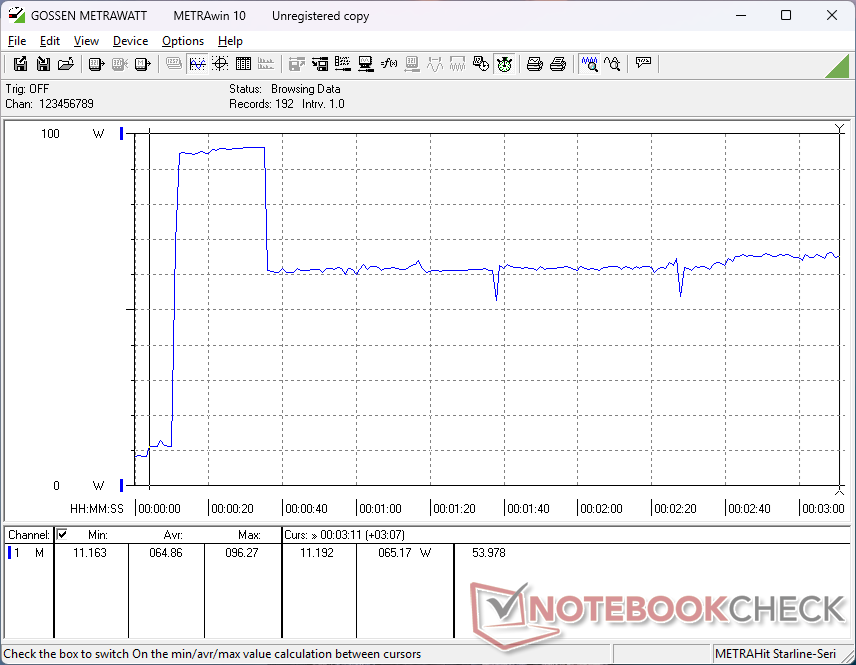 La configurazione Core Ultra X7 OLED è generalmente più esigente della configurazione base Core Ultra 5 IPS, anche quando è al minimo, a causa del pannello OLED. L'esecuzione di Cyberpunk 2077 e Prime95 consuma circa il 38% e il 35% in più di energia, rispettivamente. Tuttavia, l'aumento delle prestazioni supera di gran lunga la maggiore richiesta di energia e quindi le prestazioni per watt sono ancora superiori con l'opzione Core Ultra X7.