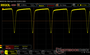Il display sfarfalla a 240.2 Hz (Probabilmente a causa dell'uso di PWM) Flickering rilevato ad una luminosita' di 100 % o inferiore. Non dovrebbe verificarsi flickering o PWM sopra questo valore di luminosita'. La frequenza di 240.2 Hz è relativamente bassa, quindi gli utenti sensibili potrebbero notare il flickering ed accusare stanchezza agli occhi a questo livello di luminosità e a livelli inferiori. In confronto: 52 % di tutti i dispositivi testati non utilizza PWM per ridurre la luminosita' del display. Se è rilevato PWM, una media di 7914 (minimo: 5 - massimo: 343500) Hz è stata rilevata. | |||