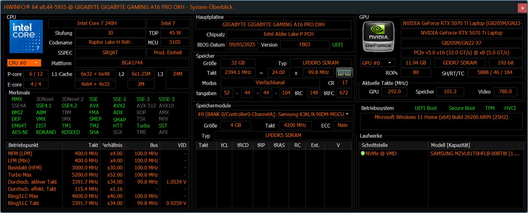 | Gigabyte Gaming A16 Pro GA6DH (Core 7 240H, RTX 5070 Ti) Intel Core 7 240H ⎘ NVIDIA GeForce RTX 5070 Ti Laptop ⎘ 32 GB Memoria, 1000 GB SSD | Amazon: Prezzo di listino: 2300 Euro | 2.4 kg | 22.99 mm | 16.00" 2560x1600 189 PPI IPS | |