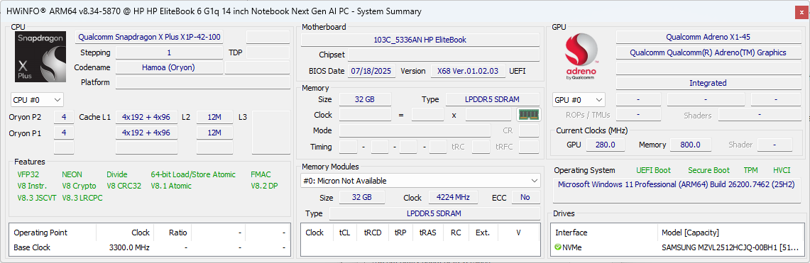 | HP EliteBook 6 G1q 14 Qualcomm Snapdragon X Plus X1P-42-100 ⎘ Qualcomm SD X Adreno X1-45 1.7 TFLOPS ⎘ 32 GB Memoria, 512 GB SSD | Amazon: $1,382.03 Prezzo di listino: 1300 USD | 1.5 kg | 17 mm | 14.00" 1920x1200 162 PPI IPS | |