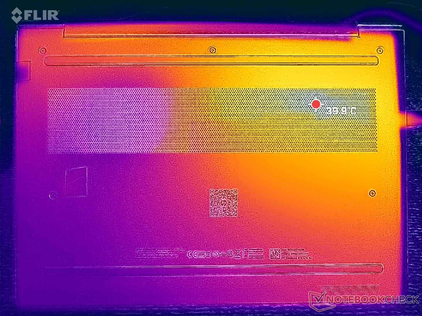 Le temperature di superficie sono sensibilmente più calde nella metà sinistra dello chassis, vicino al processore. I punti caldi possono raggiungere circa 40 C, che sono solo leggermente più freddi di quelli che abbiamo registrato sul ThinkPad E14 Gen 7.