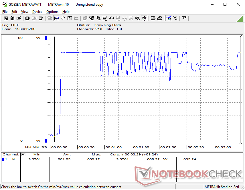 Siamo riusciti a registrare un assorbimento massimo di 69 W dal piccolo (~8,9 x 5 x 2,8 cm) adattatore AC USB-C da 65 W.
