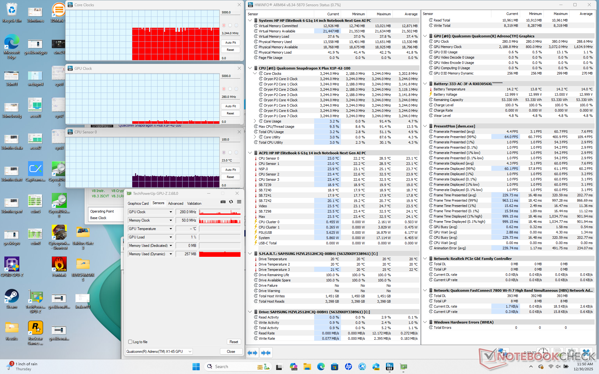 | HP EliteBook 6 G1q 14 SD X Plus X1P-42-100, Adreno X1-45 1.7 TFLOPS, Samsung PM9A1 MZVL2512HCJQ, IPS, 1920x1200, 14" | HP EliteBook 8 G1a 14 AD3E9ET R7 250, Radeon 780M, Samsung PM9C1 MZVL81T0HELB-00BTW, IPS LED, 1920x1200, 14" | HP ProBook 445 G10 R5 7530U, Vega 7, Kioxia BG5 KBG50ZNS512G, IPS, 1920x1080, 14" | Lenovo ThinkPad E14 Gen 7 21U2002QGE Core Ultra 5 228V, Arc 130V, Samsung PM9C1b MZVL81T0HFLB-00BH1, IPS, 2880x1800, 14" | Dell Pro 14 Plus PB14255 GH77W Ryzen AI 7 PRO 350, Radeon 860M, Micron 2500 1TB MTFDKBA1T0QGN, IPS LED, 1920x1200, 14" | Asus ExpertBook B5 B5404CMA Ultra 7 155U, Graphics 4-Core iGPU (Arrow Lake), Micron 2400 MTFDKBA1T0QFM, IPS, 1920x1200, 14" | |