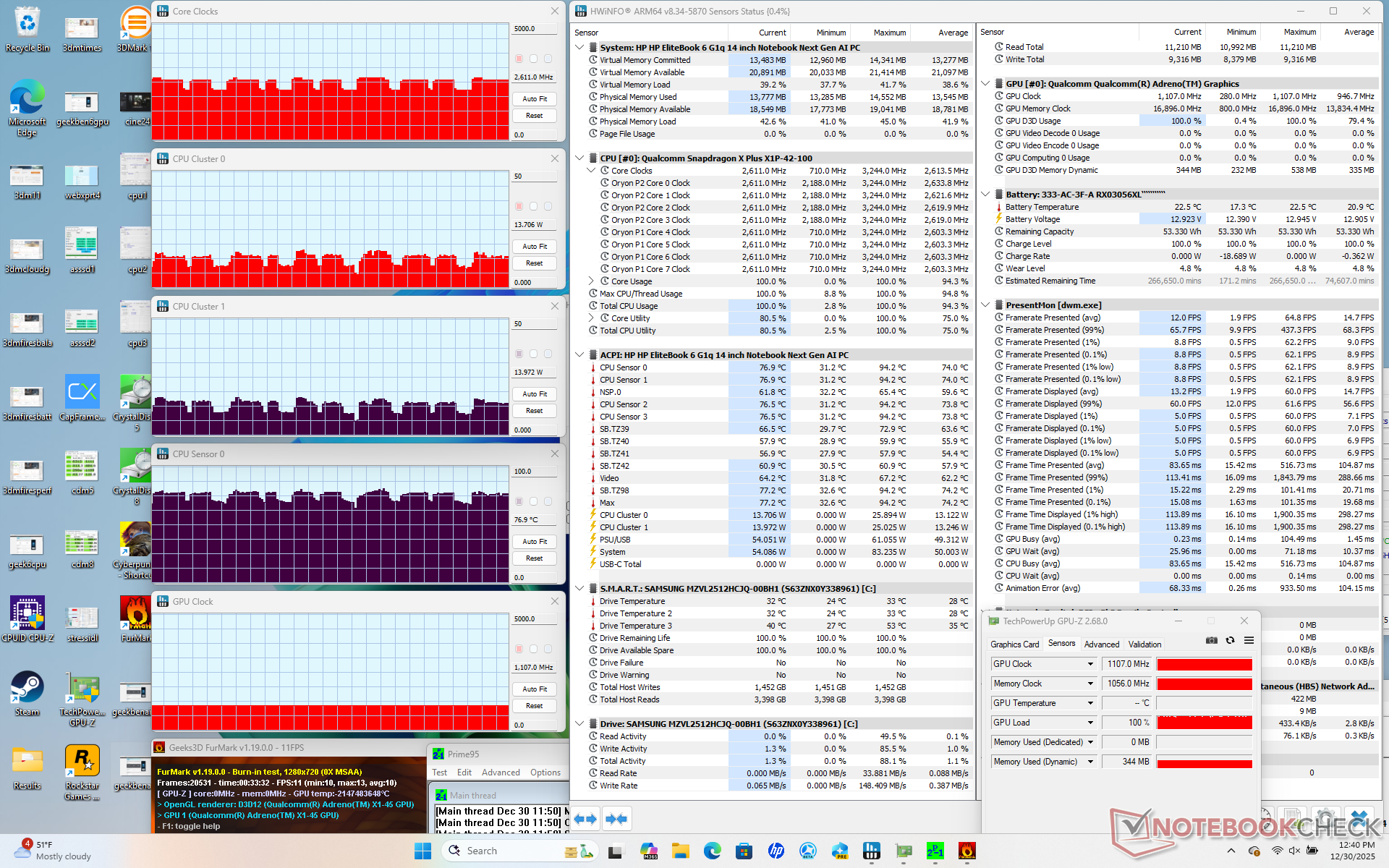 | Prime95 + FurMark Stress | 2,2 - 2,7 | 1107 | 65 - 82 |
