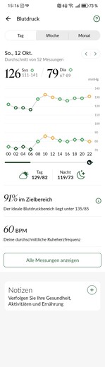L'esperienza ha dimostrato che Hilo Band misura la pressione arteriosa da due a tre volte all'ora e poi visualizza un valore medio per blocchi di due ore, nonché l'intero intervallo misurato. È inoltre possibile visualizzare tutte le singole misurazioni. Le misurazioni sono categorizzate direttamente in Ottimale, Normale, Elevato e Troppo Alto. Un ulteriore sistema di codifica a colori lo rende molto chiaro. L'attività fisica di solito significa che non vengono registrati valori per questo periodo.