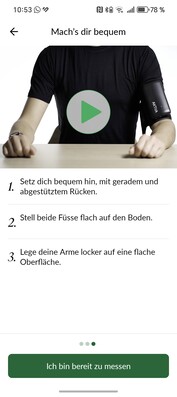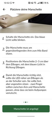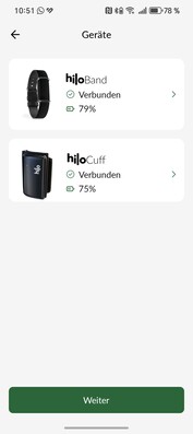 Il bracciale in dotazione (Bluetooth 4.2) viene utilizzato a questo scopo e può essere facilmente accoppiato all'interno dell'app. Una volta che l'app riconosce che entrambi i dispositivi sono collegati, è possibile avviare il processo di calibrazione, che viene guidato passo dopo passo. Opzionalmente, possono essere riprodotti anche dei video per spiegare nuovamente le singole fasi. La calibrazione viene eseguita effettuando tre misurazioni consecutive, con la fascia Hilo indossata sulla mano più debole e il bracciale sul lato opposto. Questo funziona senza problemi nella recensione e troviamo che la configurazione sia molto chiara e facile da eseguire, anche per le persone meno inclini alla tecnica.