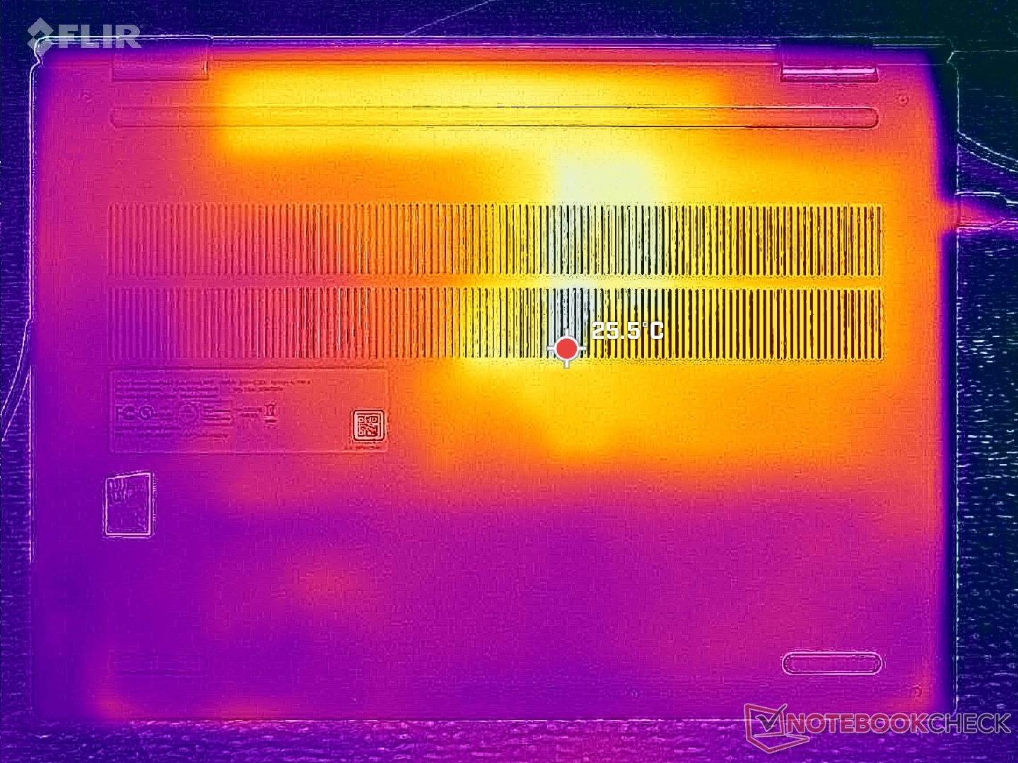 (+) In idle, la temperatura media del lato superiore è di 24.8 °C / 77 F, rispetto alla media deld ispositivo di 30.3 °C / 87 F.
