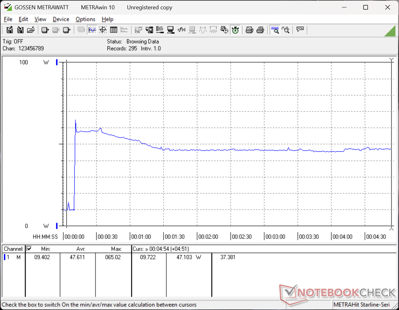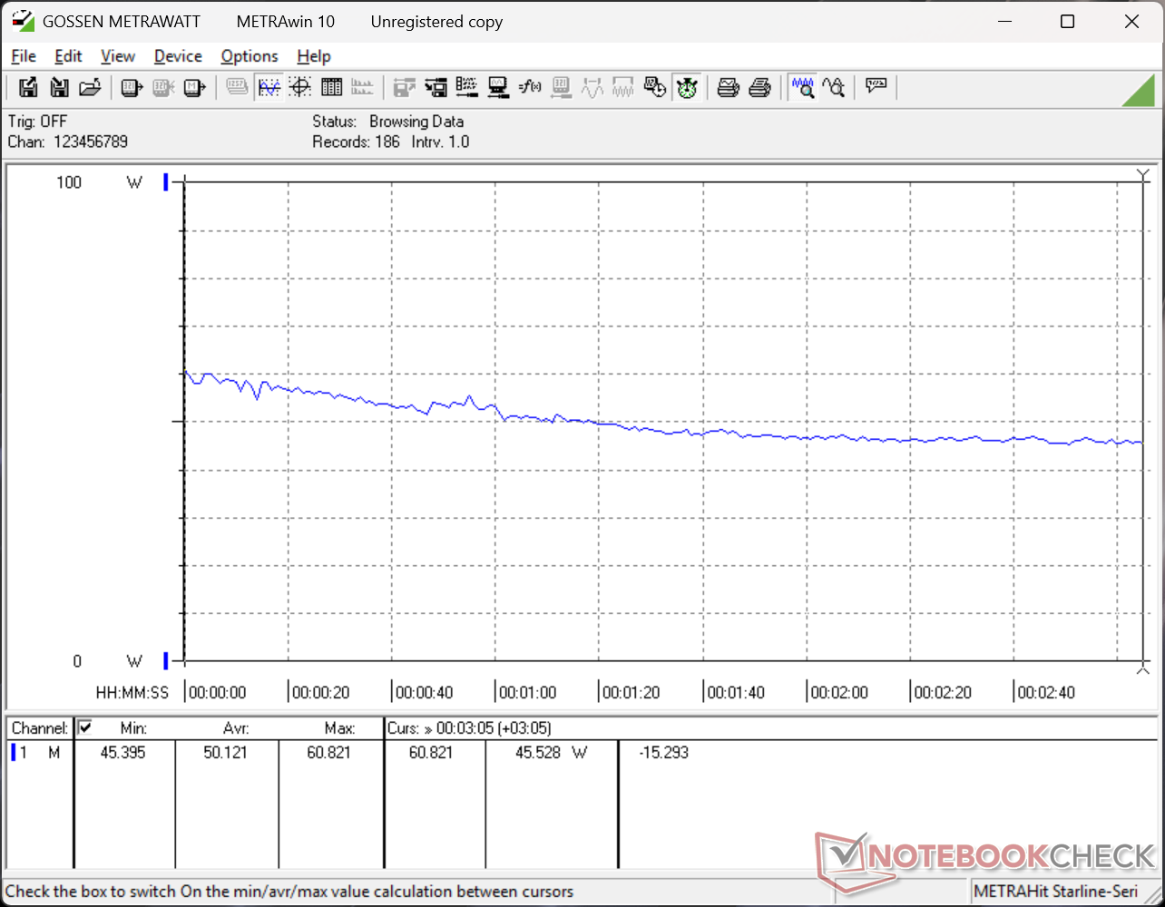 Il sistema può assorbire l'intera potenza di 65 W dell'adattatore CA USB-C di piccole dimensioni (9 x 4,6 x 2,7 cm) quando la CPU è completamente sollecitata, ma questo è solo temporaneo, come mostra il grafico sottostante.