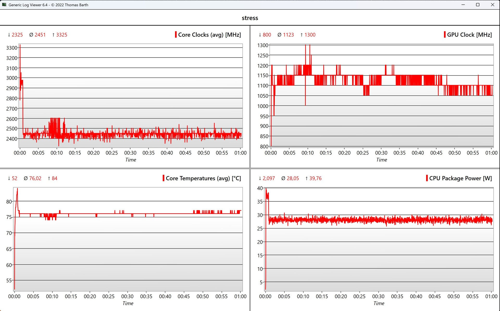 Il modello Lunar Lake ha un vantaggio in termini di consumo energetico rispetto all'Arrow Lake E14. Sotto carico, raggiunge un picco di 61 watt prima di stabilizzarsi rapidamente a circa 48 watt. L'adattatore di alimentazione da 65 watt incluso è quindi più che sufficiente.