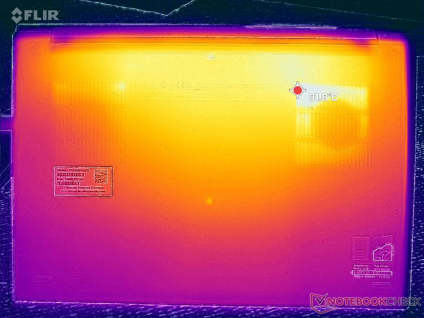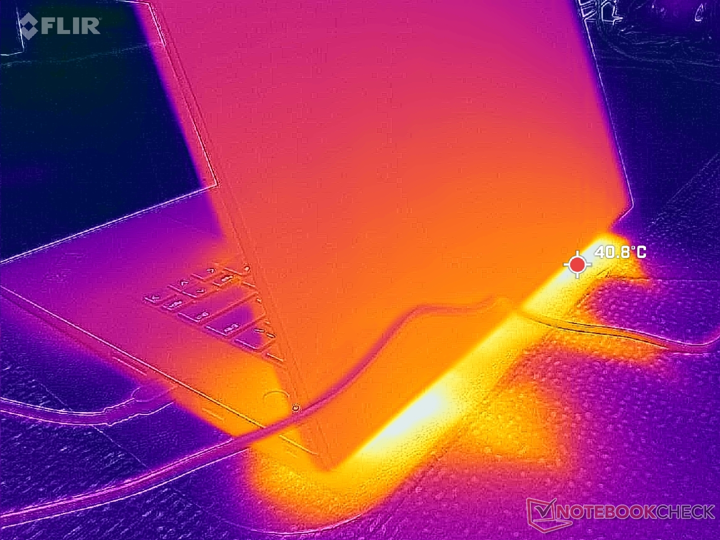 Lo sviluppo della temperatura superficiale è simmetrico, con punti caldi vicino al centro della tastiera che raggiungono i 40 C - 45 C quando si eseguono carichi molto impegnativi come Prime95 o FurMark. I risultati sono più freddi del previsto, considerando il design sottile dello chassis. Il ThinkPad P1 Gen 7 dello scorso anno raggiungeva temperature superficiali più calde in confronto, probabilmente a causa della sua potenza di 170 W più elevata.