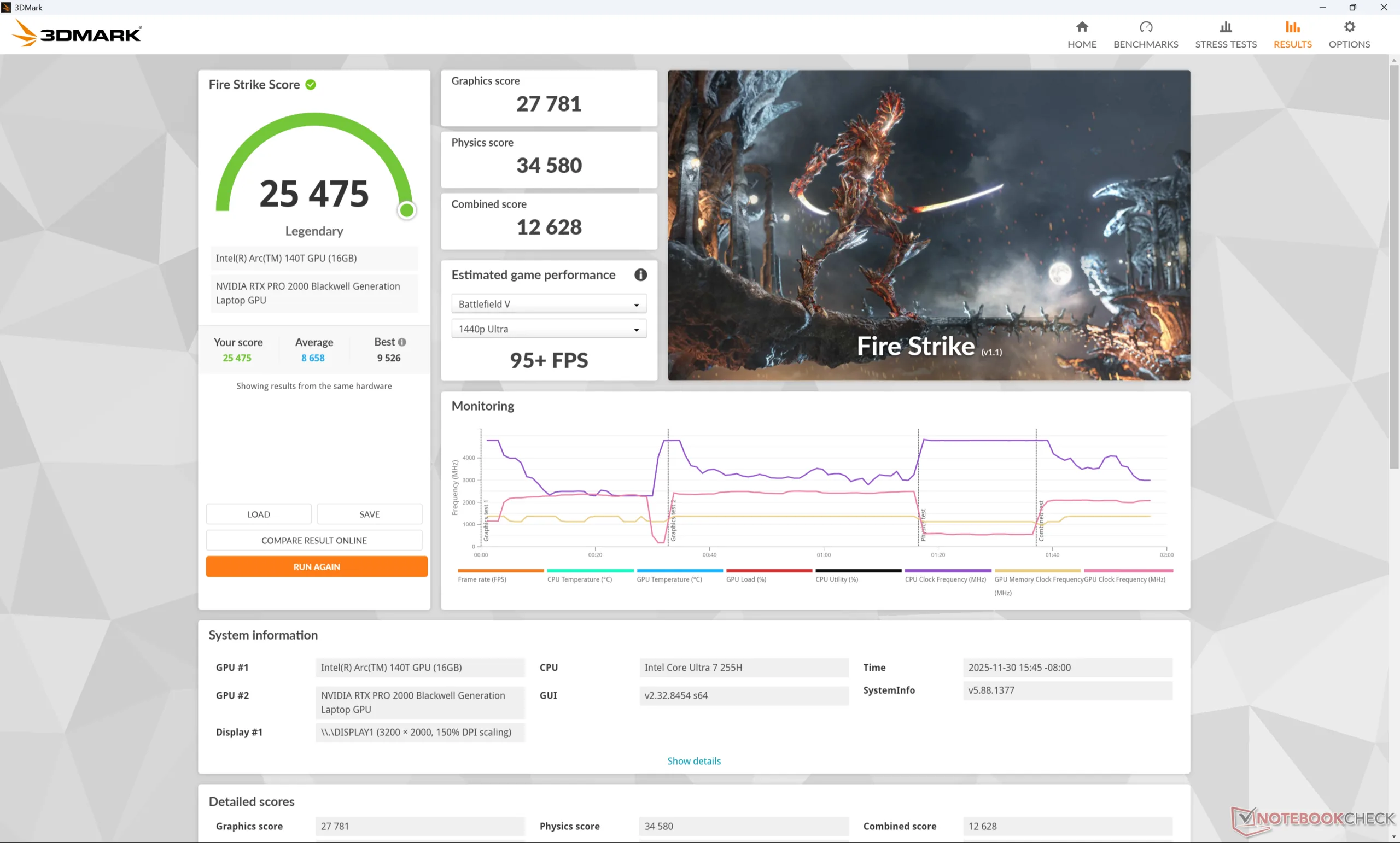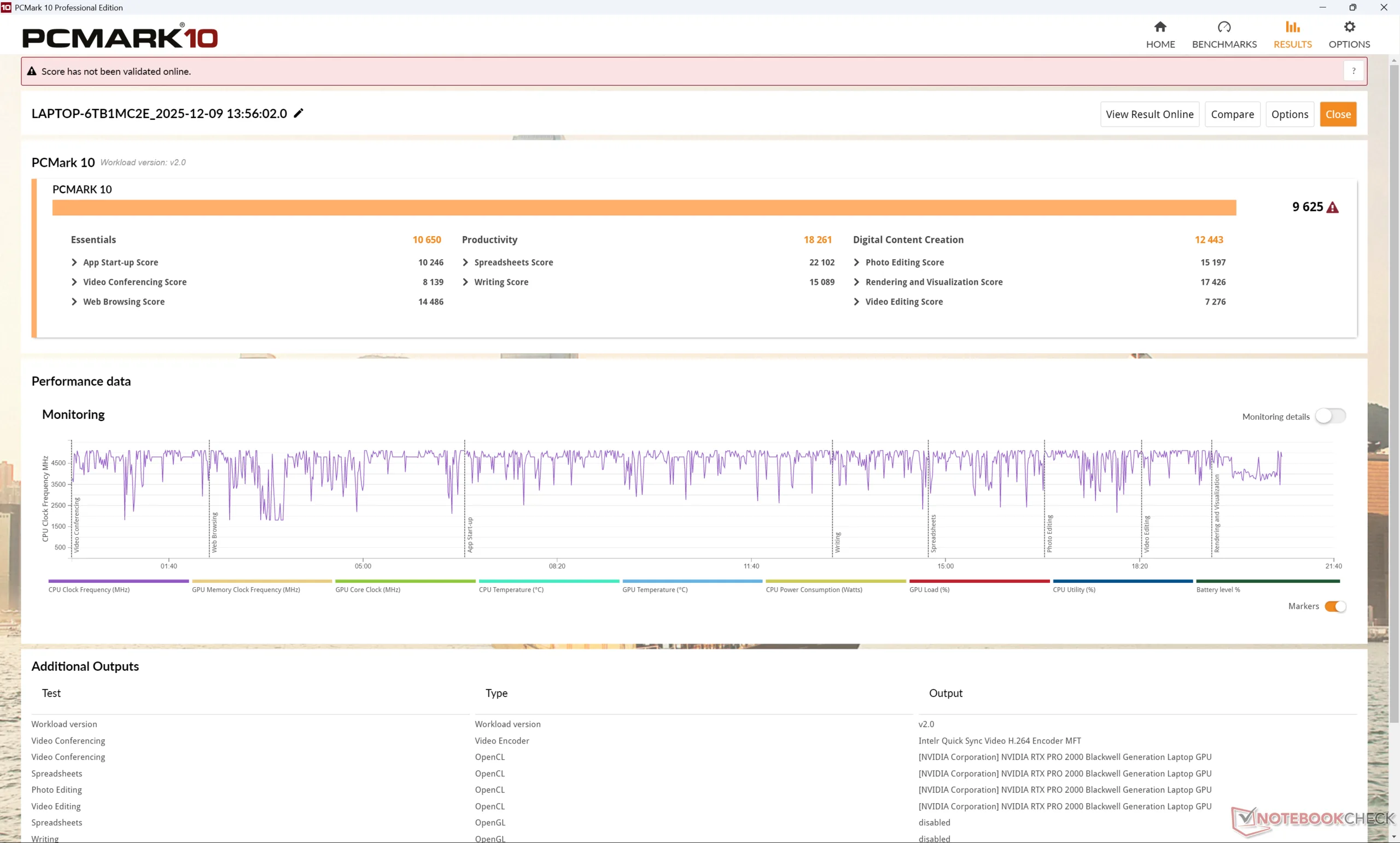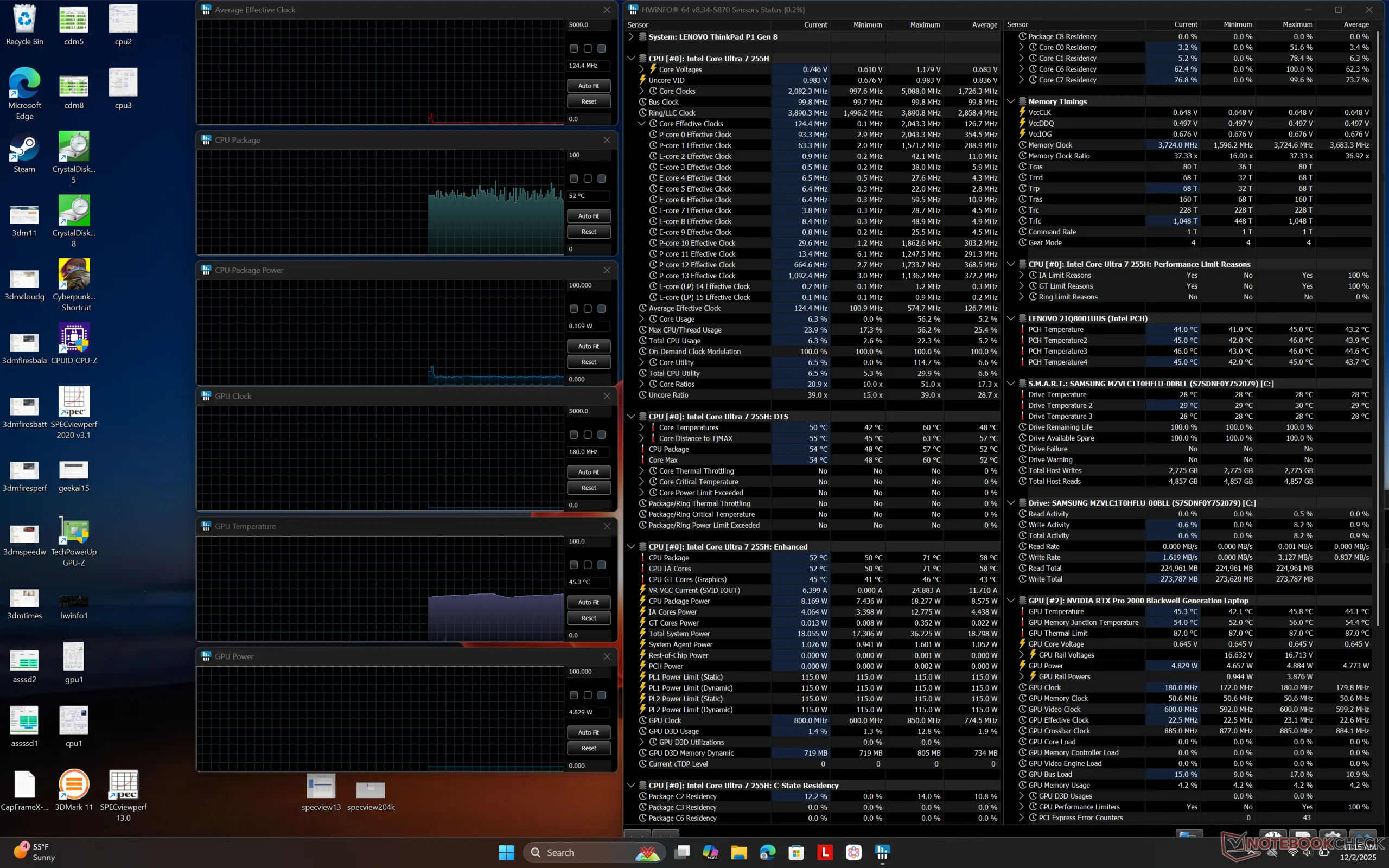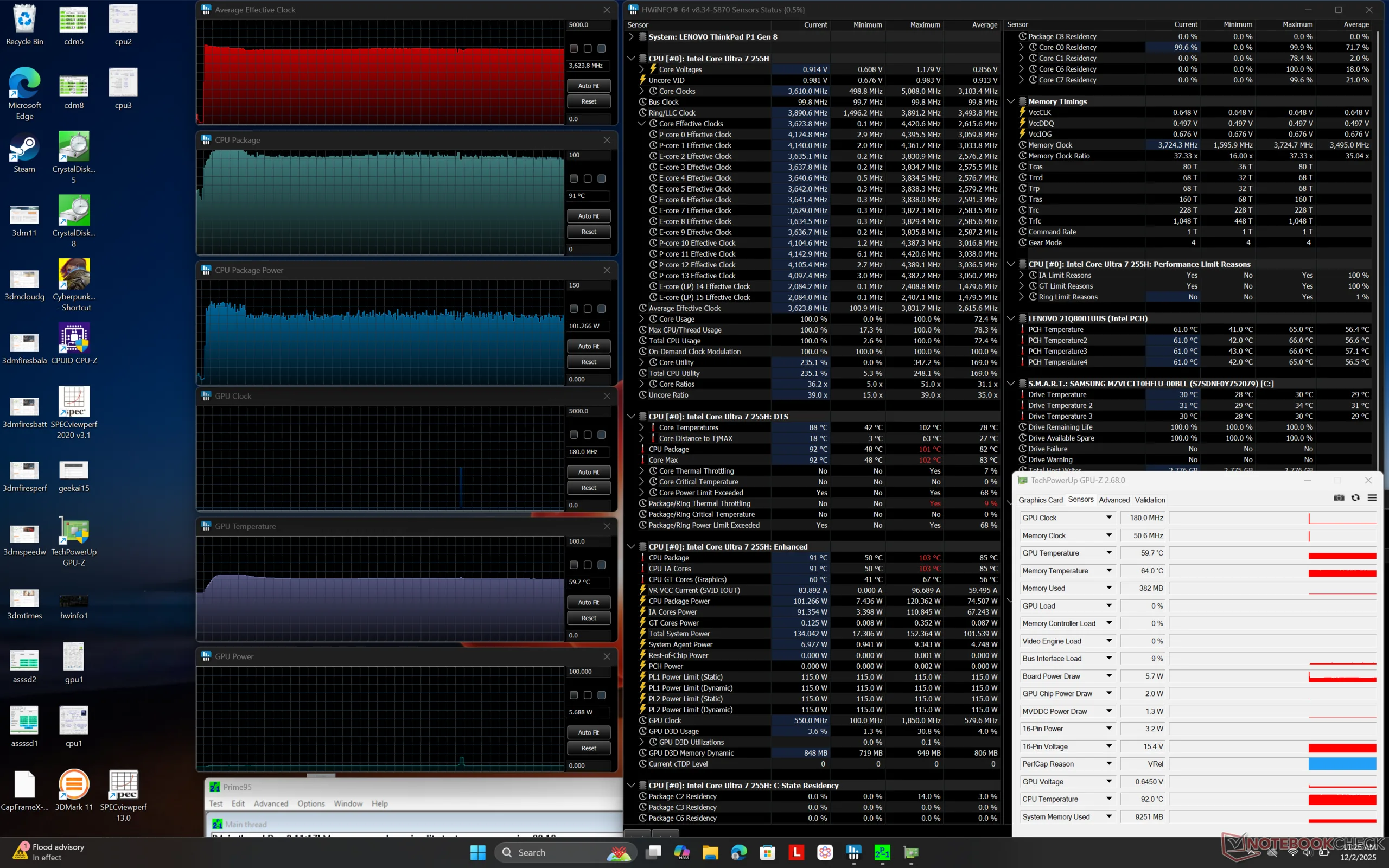 La CPU raggiunge i 3,8 GHz, 120 W e 100 C quando si avvia lo stress Prime95, prima di scendere leggermente e stabilizzarsi a 3,6 GHz e 101 W per mantenere una temperatura del core più gestibile di 91 C. L'assorbimento di potenza della scheda GPU salta da 63 W a quasi 70 W quando si passa dalla modalità Bilanciata a quella Prestazioni, per cui suggeriamo di eseguire l'operazione in modalità Prestazioni, nonostante le temperature del core leggermente più elevate di ~75 C. Il clock della memoria della GPU, in particolare, salta da 1125 MHz a 1375 MHz quando si passa alla modalità Prestazioni.